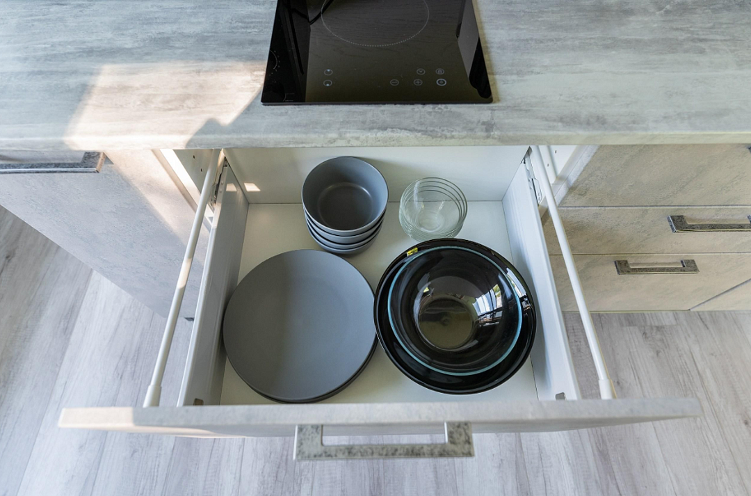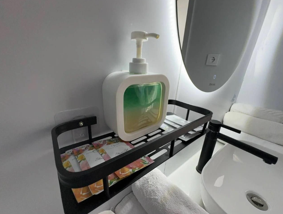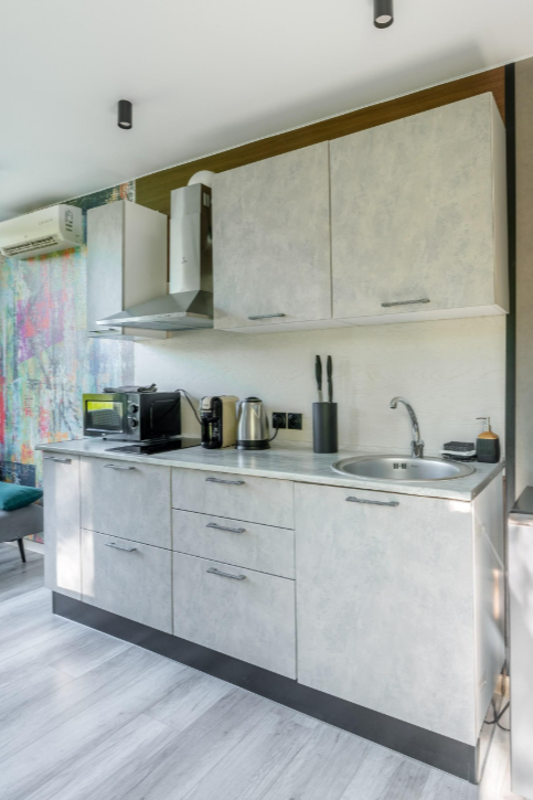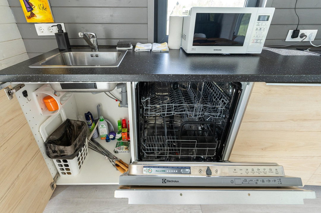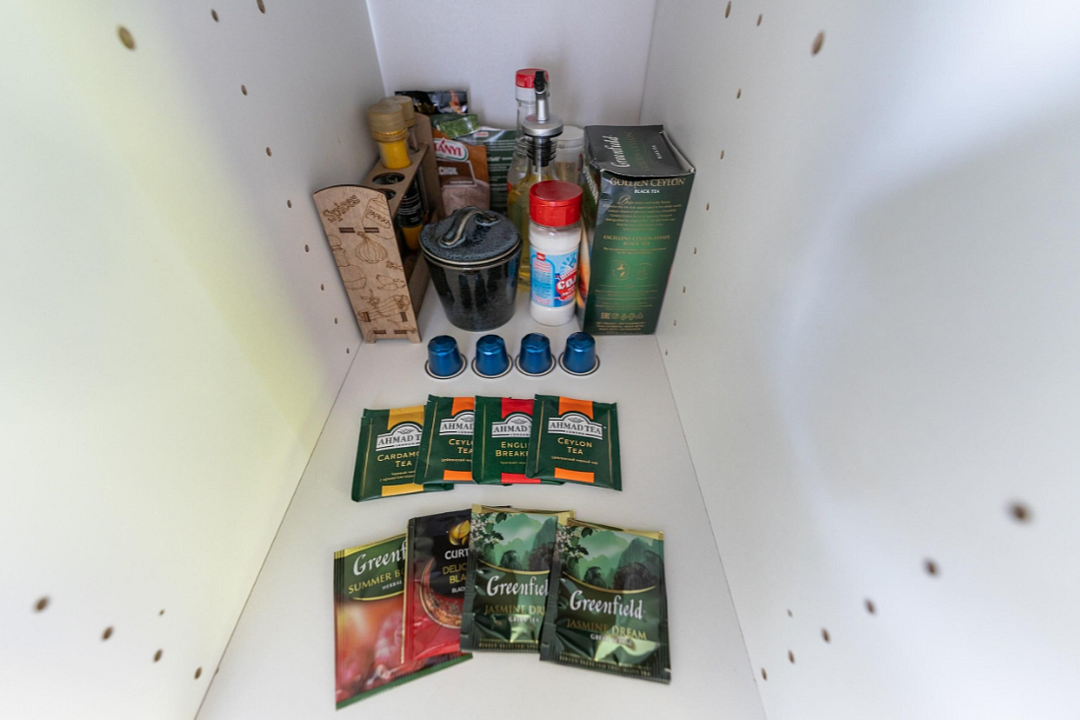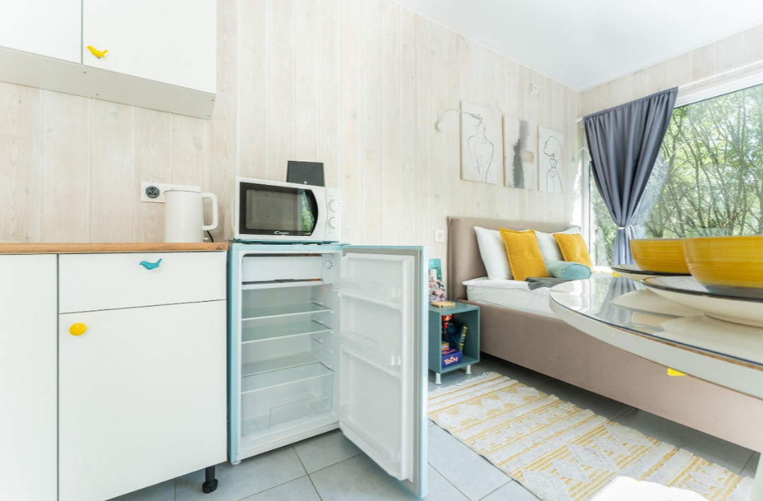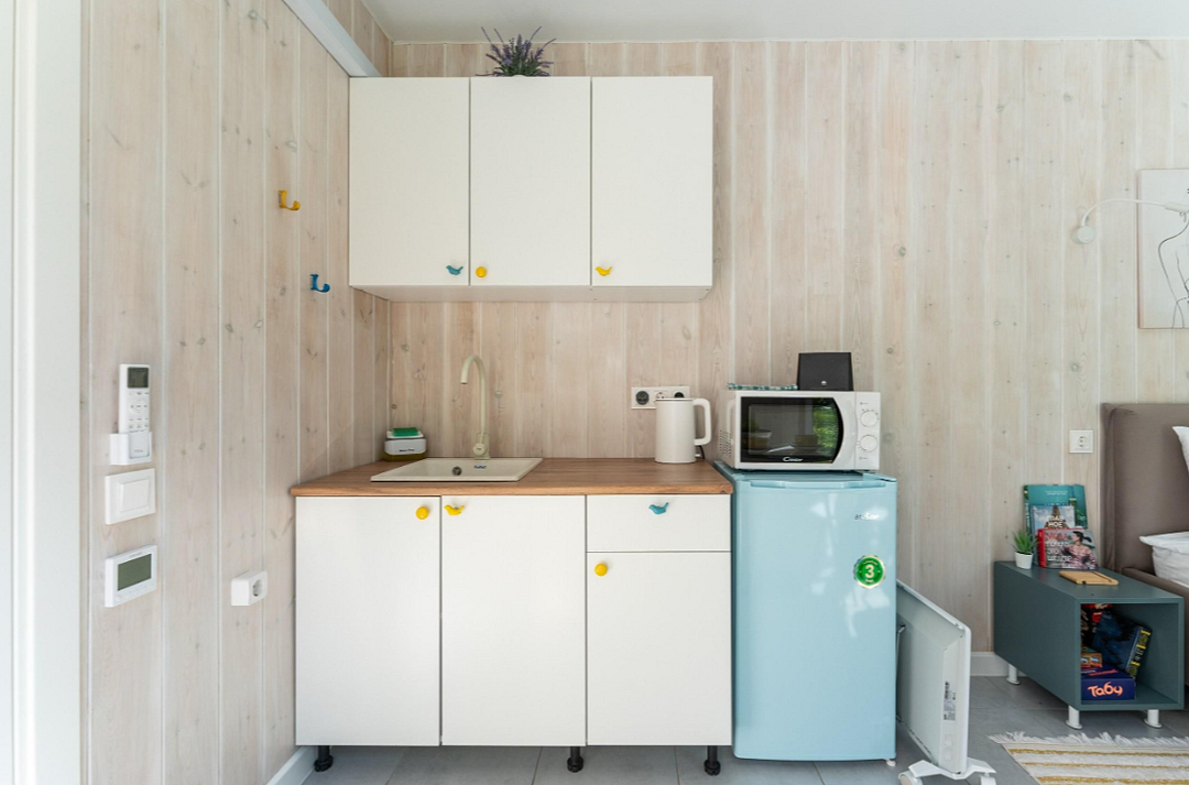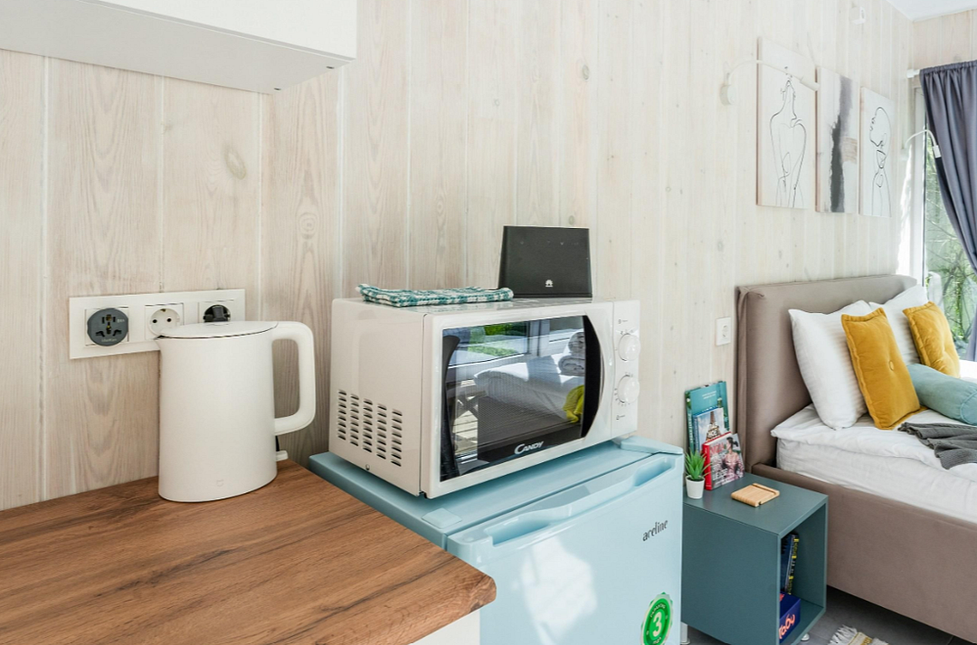 - полностью оборудованная кухня (микроволновая печь, индукционная плита, электрочайник, холодильник);