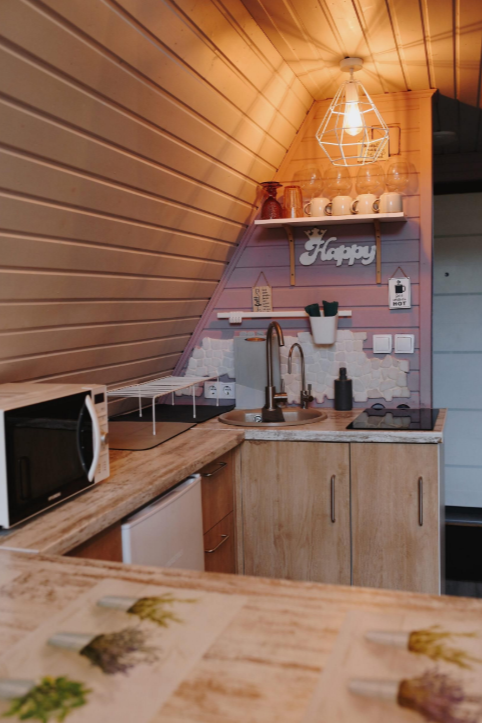 В доме есть полноценная кухня для приготовления еды, мангал около каждого домика. В доме все для комфортного проживания: белоснежное отельное белье, махровые полотенца, гель, шампунь, фен. На кухне: микроволновая печь, варочная панель, холодильник, посуда, кастрюли, чайник, сахар, соль, чай, масло. В доме комфортно и зимой, и летом. Теплый пол, обогреватель и кондиционер.