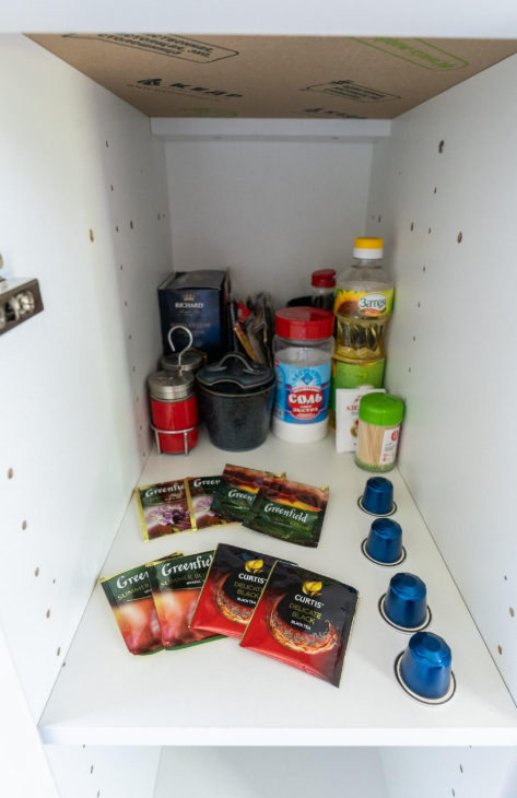 Кухня укомплектована: чай, кофе, сахар, посуда, холодильник, микроволновка.