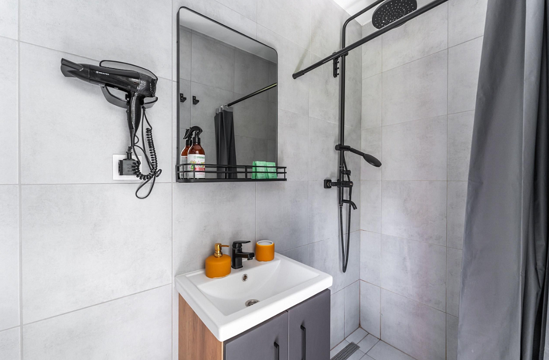 Ванная комната с тёплыми полами, феном, одноразовыми средствами гигиены, халатами и полотенцами (по запросу).