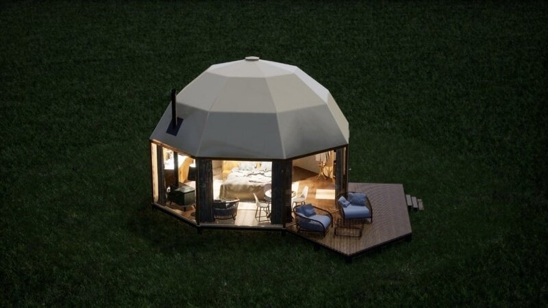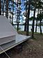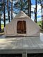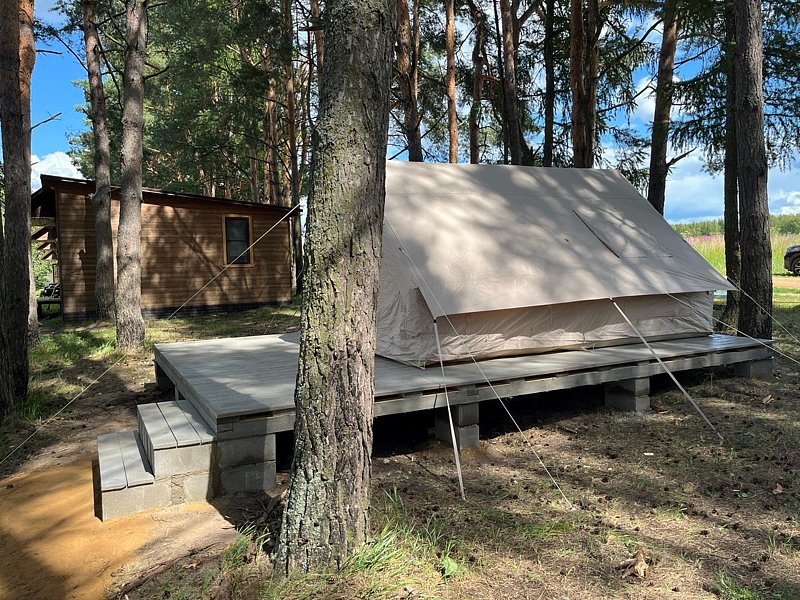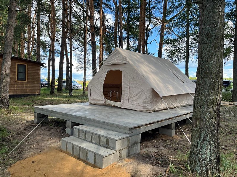 Палатка с надувным каркасом на деревянном подиуме без удобств.