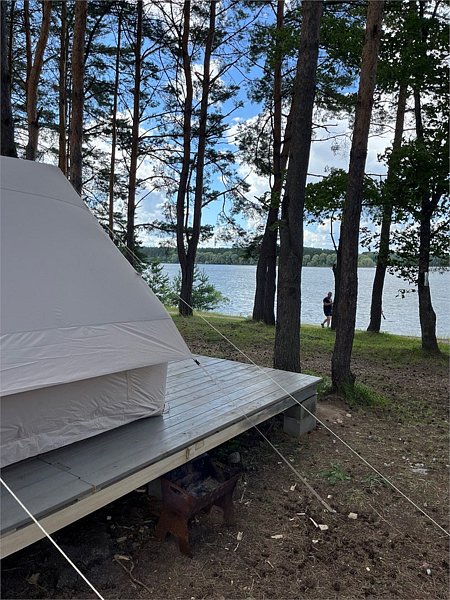 В палатке есть электричество, 2 двухспальных надувных матраса, зона для мангала, вид на водохранилище.