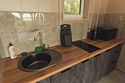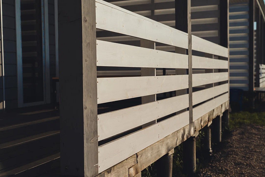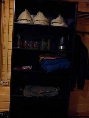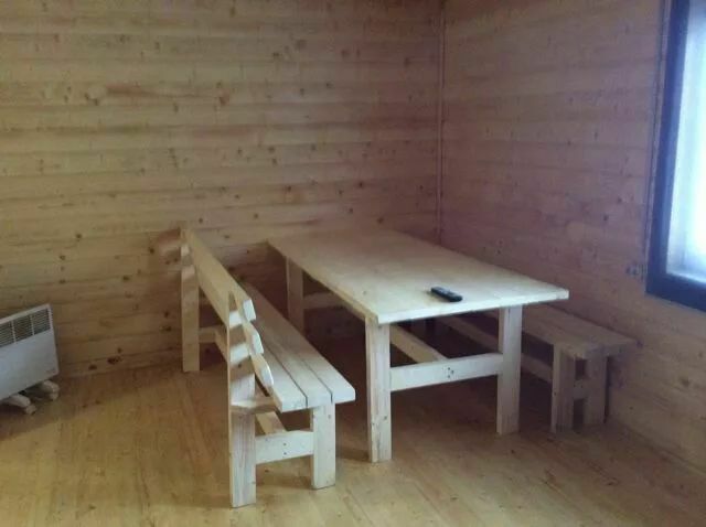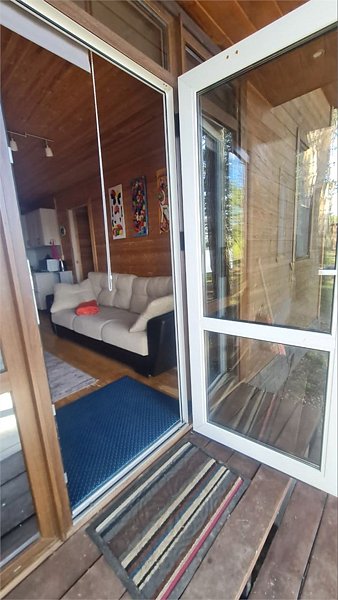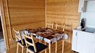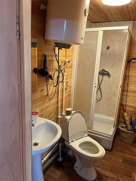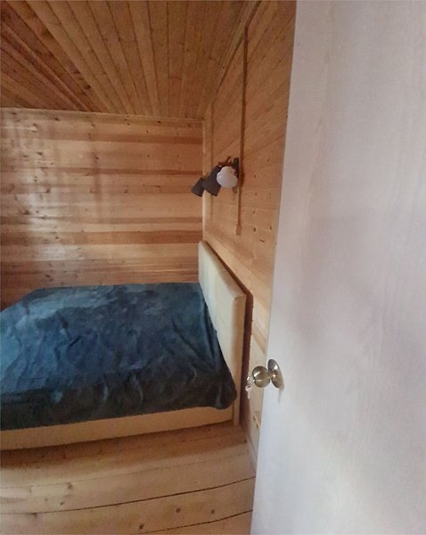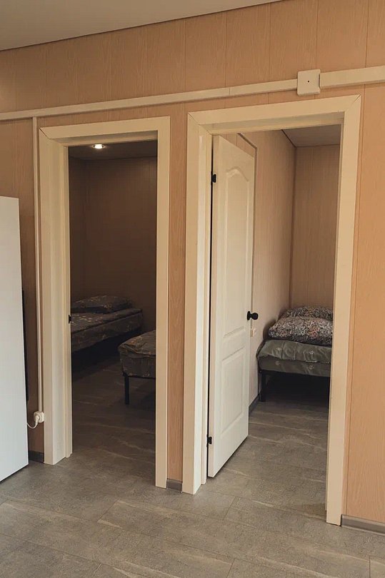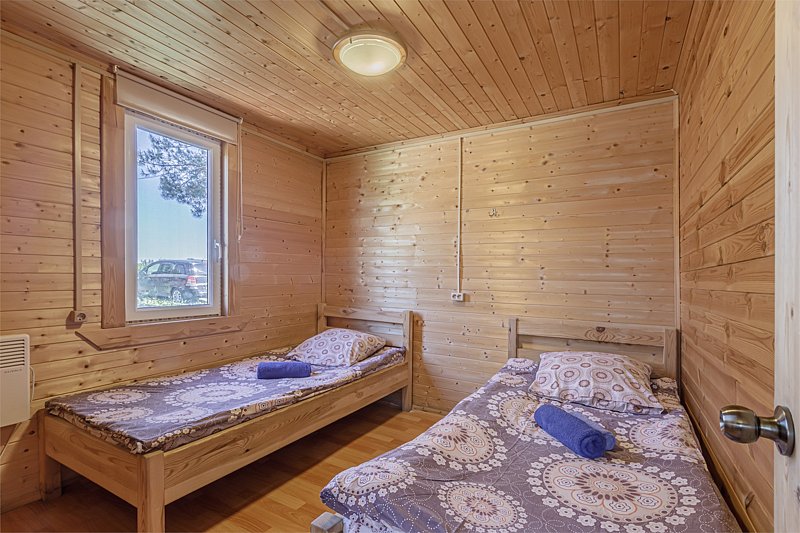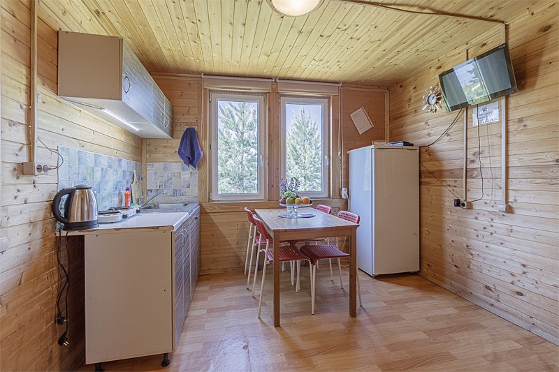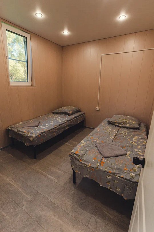 В домике - две спальни (четыре 1.5-спальные кровати), кухня с холодильником, душ/туалет, прихожая.