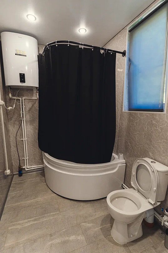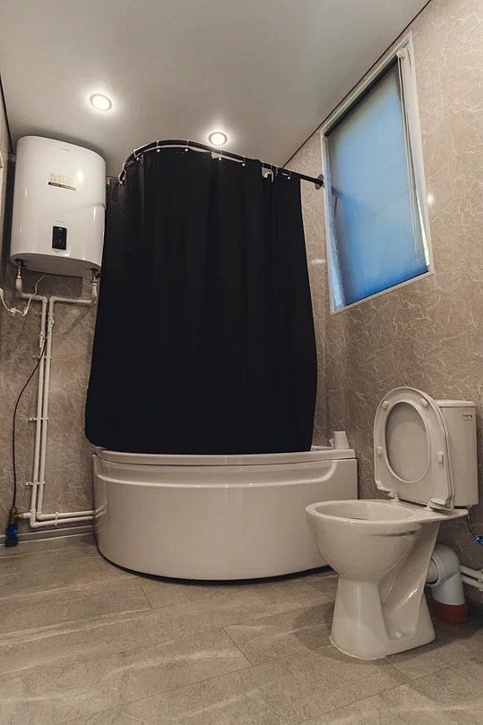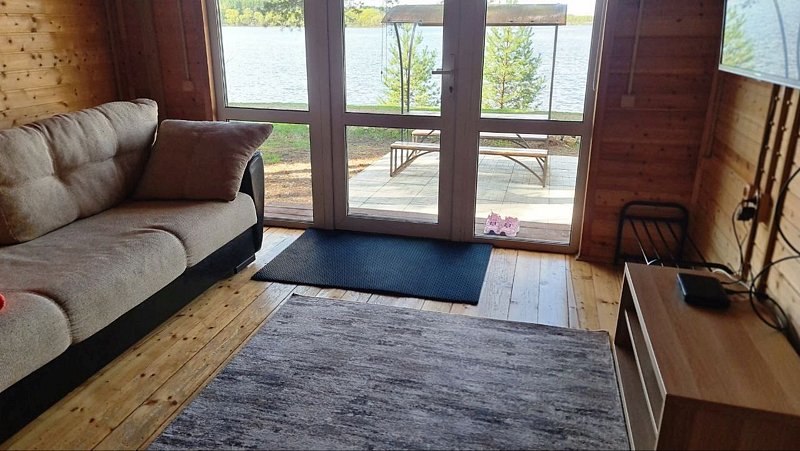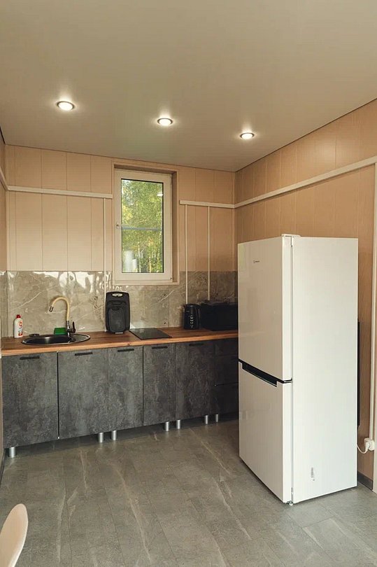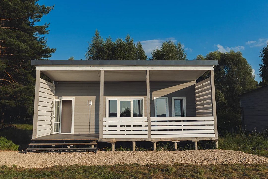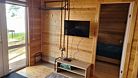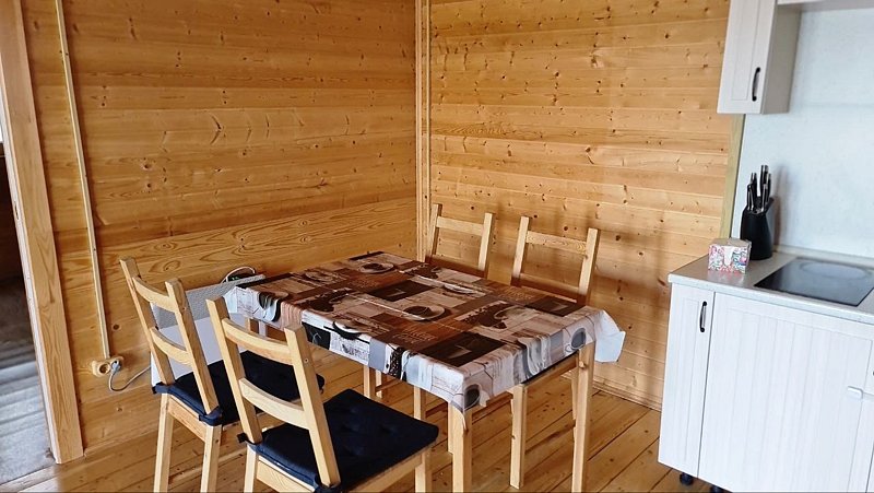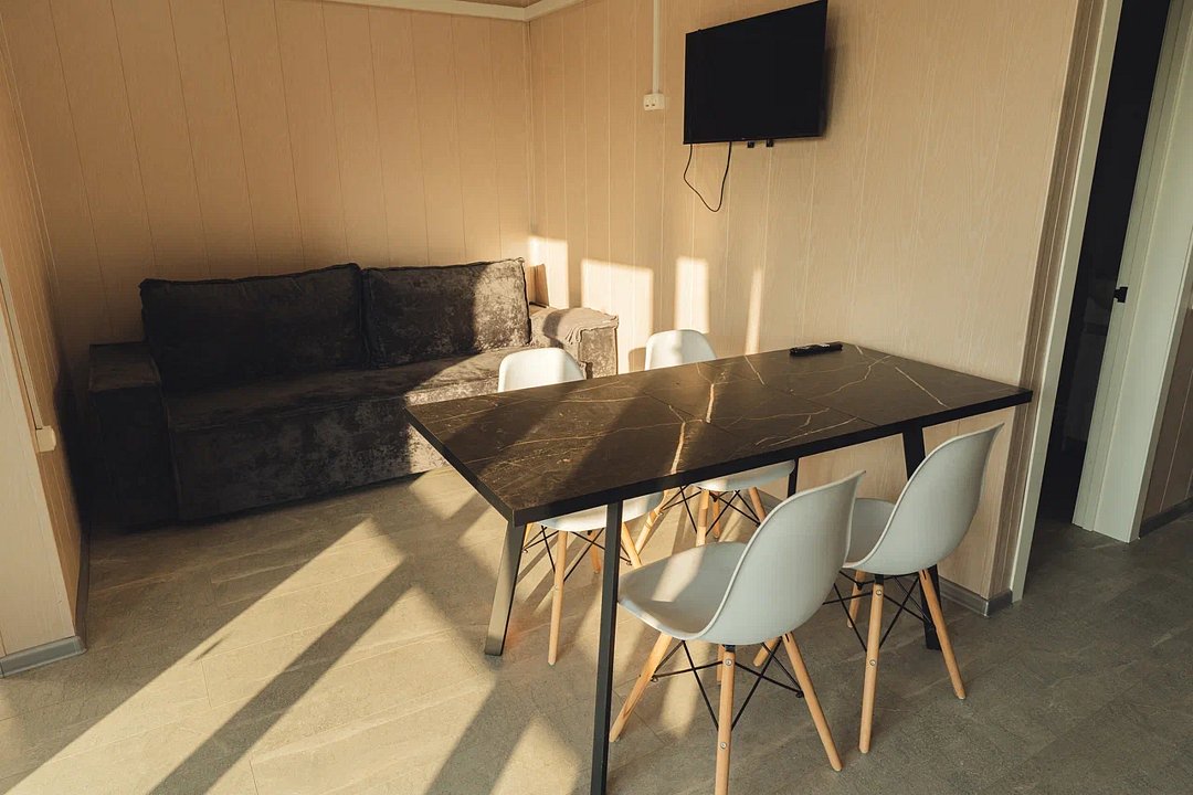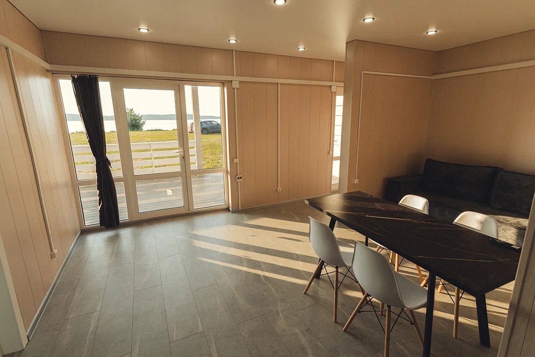 Внутри дома есть все необходимое для комфорта: модульный санузел, отопление (теплый пол), электричество, мебель, современная кухня, посуда, телевизор. Вместимость от 2 до 4 гостей.