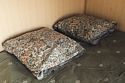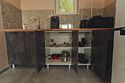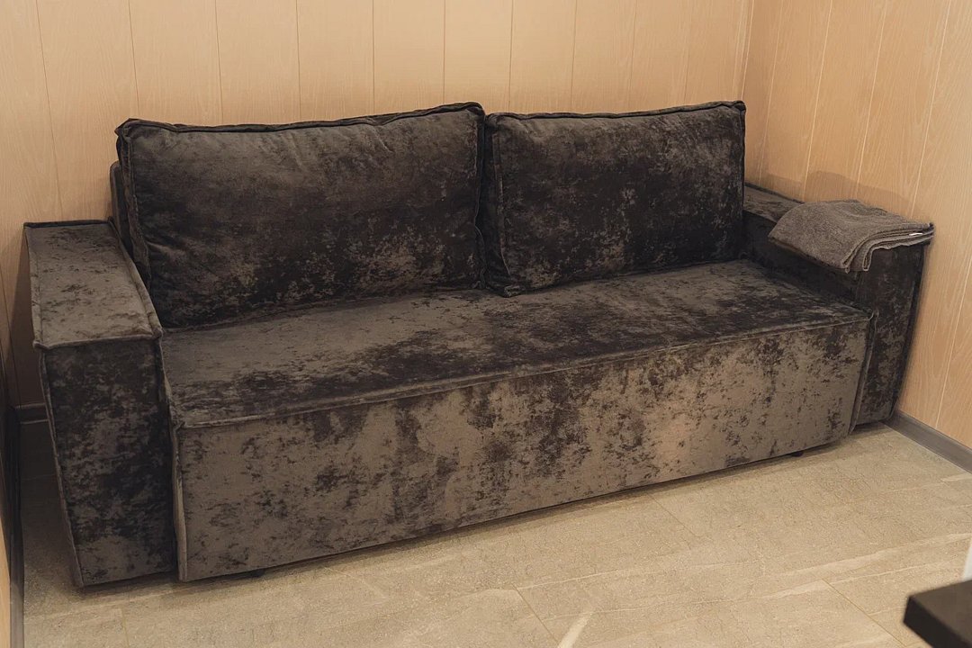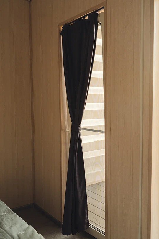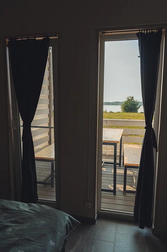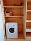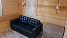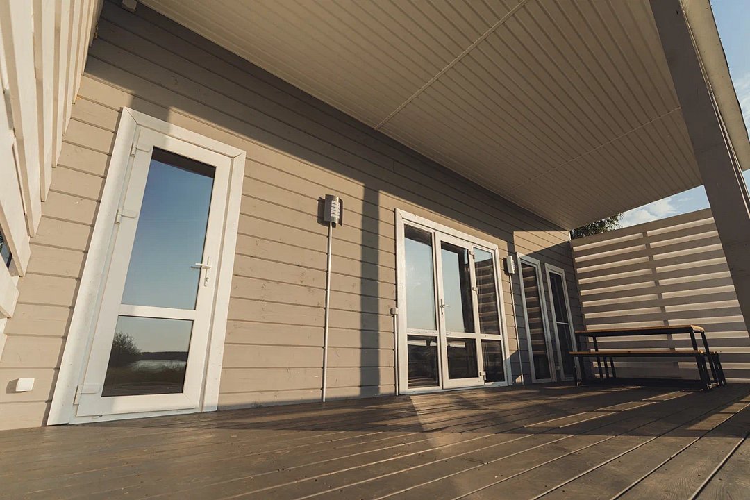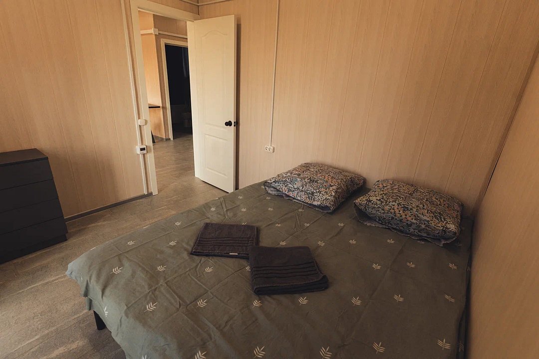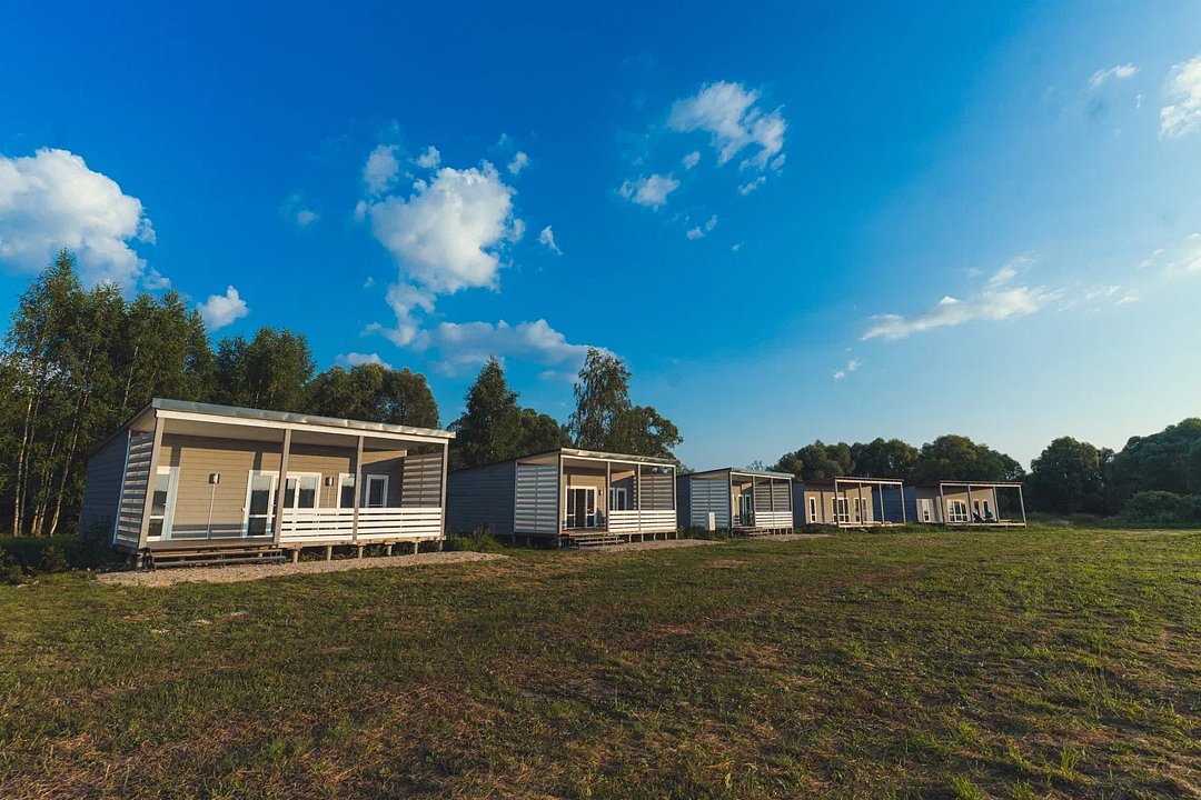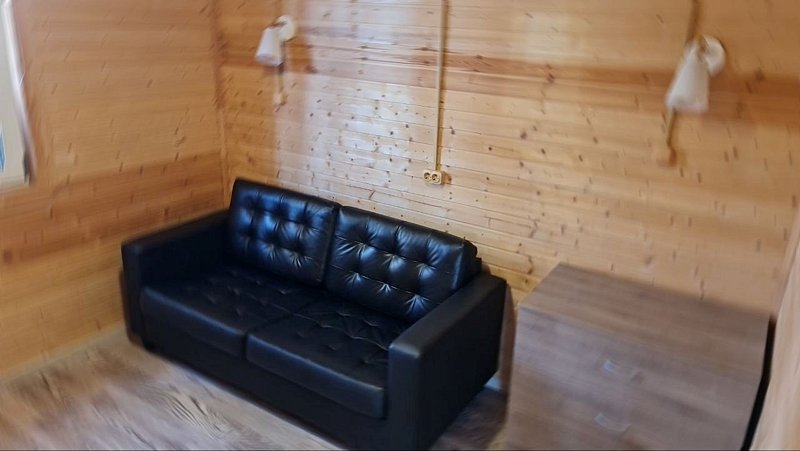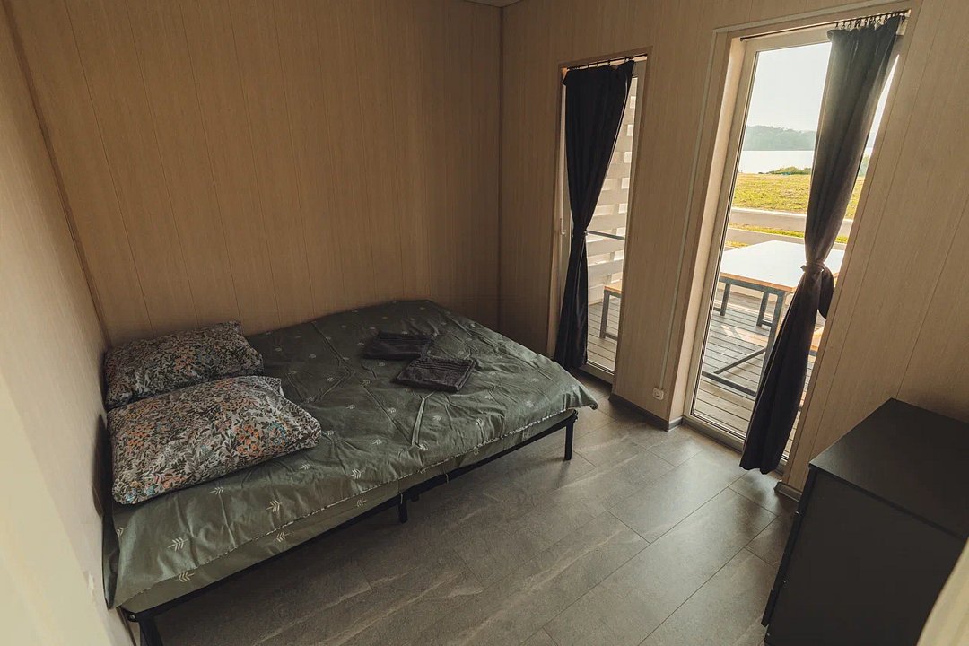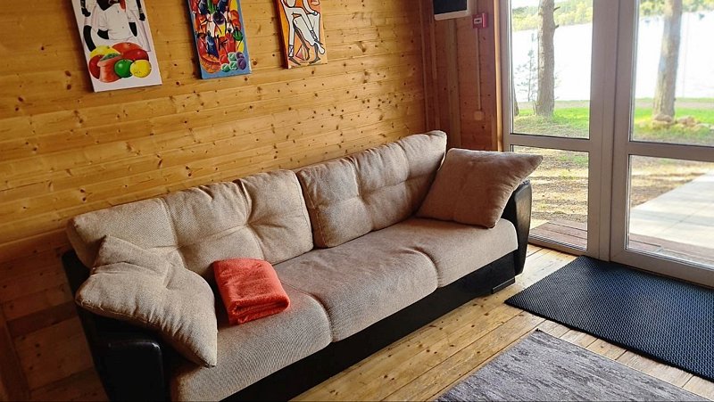 В домике — две спальни и кухня гостиная (одна евро кровать, два двухспальных дивана), кладовая с холодильником, стиральная машина, ванна/туалет.