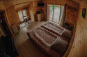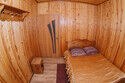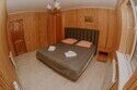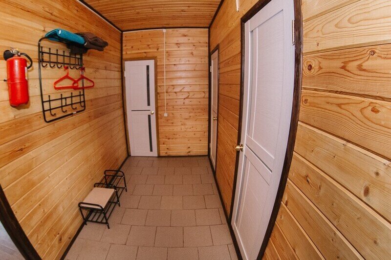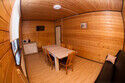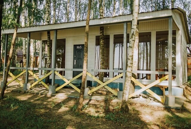 Четырехместный: спальня и зал (в спальне стоит двуспальная кровать), туалет и душ, прихожая. В зале: большой стол, кухня, холодильник, чайник и микроволновая печь, телевизор, кресло и 2 двуспальных дивана, а также есть гардеробная. Своя уличная веранда, уличный стол, мангал.