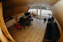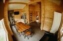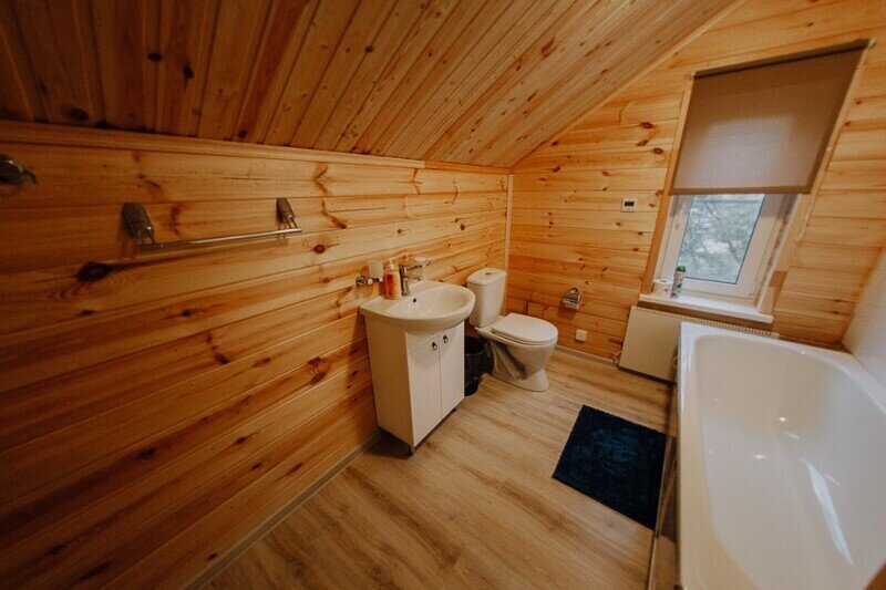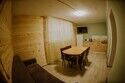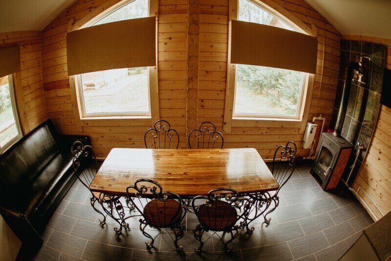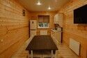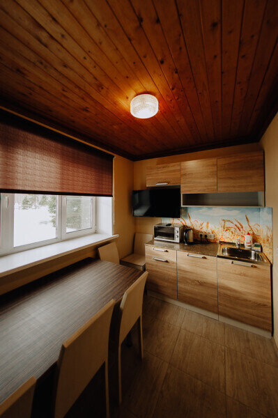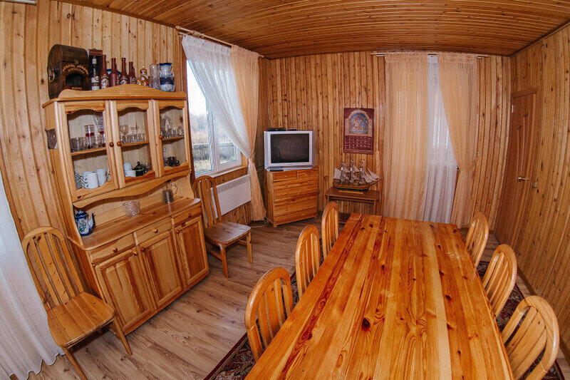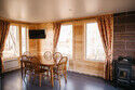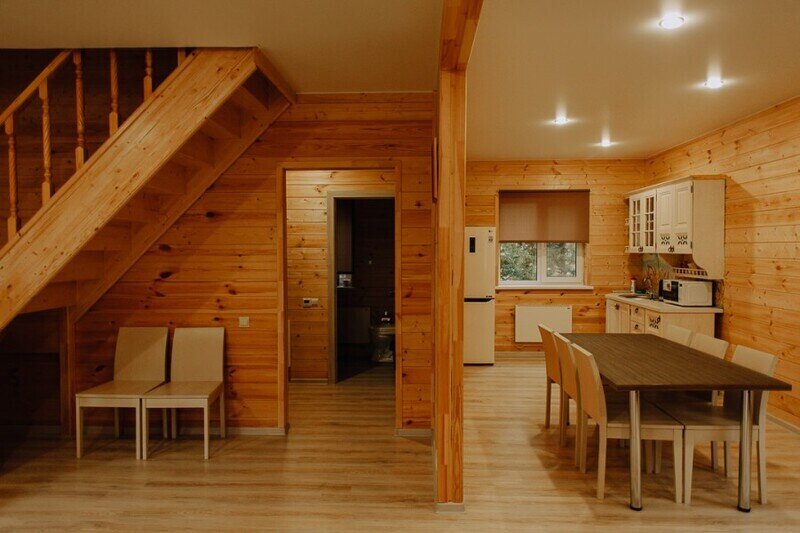 Деревянный стиль придает строению внешнюю гармонию. Интерьер выполнен в приятных светлых тонах. Две спальни, просторная гостиная — кухня, оборудованная кухонным гарнитуром, большой стол для посиделок в компании друзей или родных — все для вашего приятного времяпровождения.
