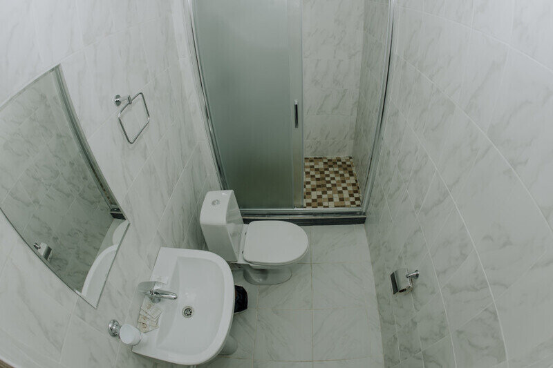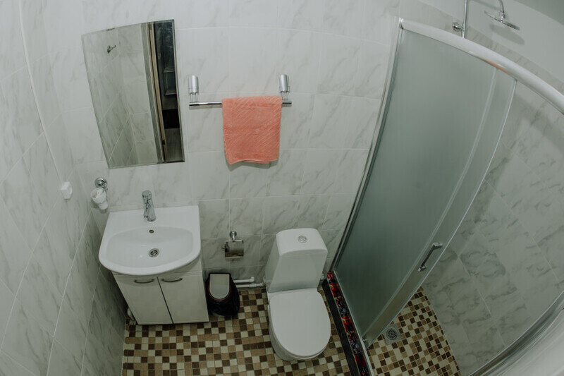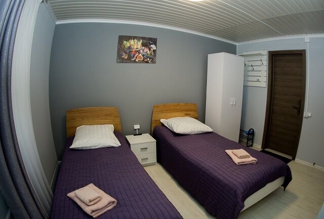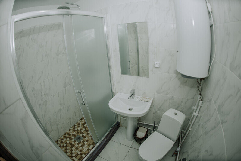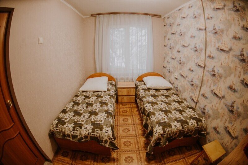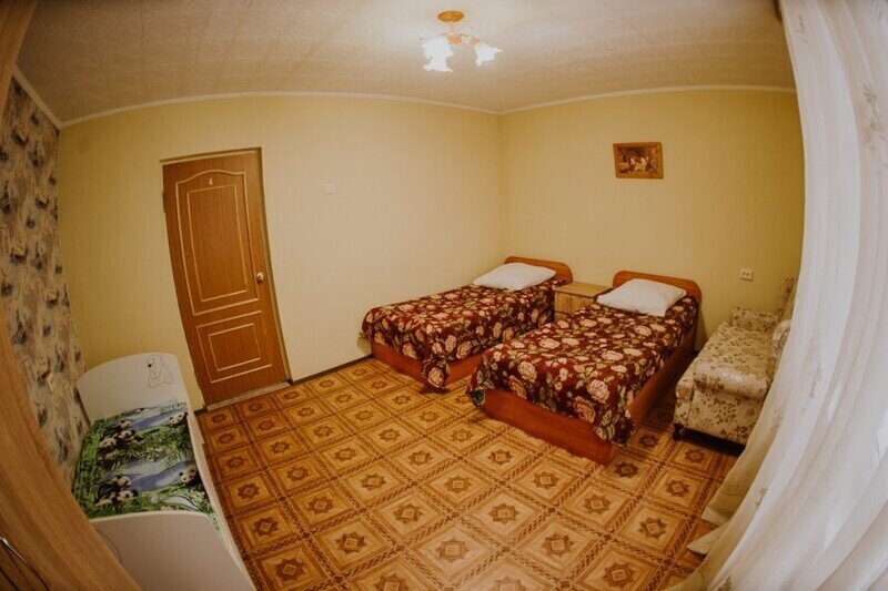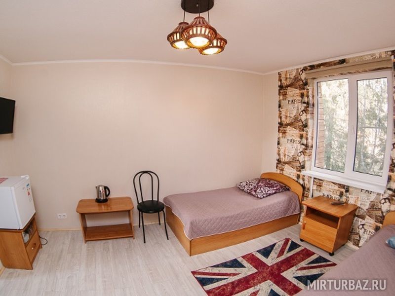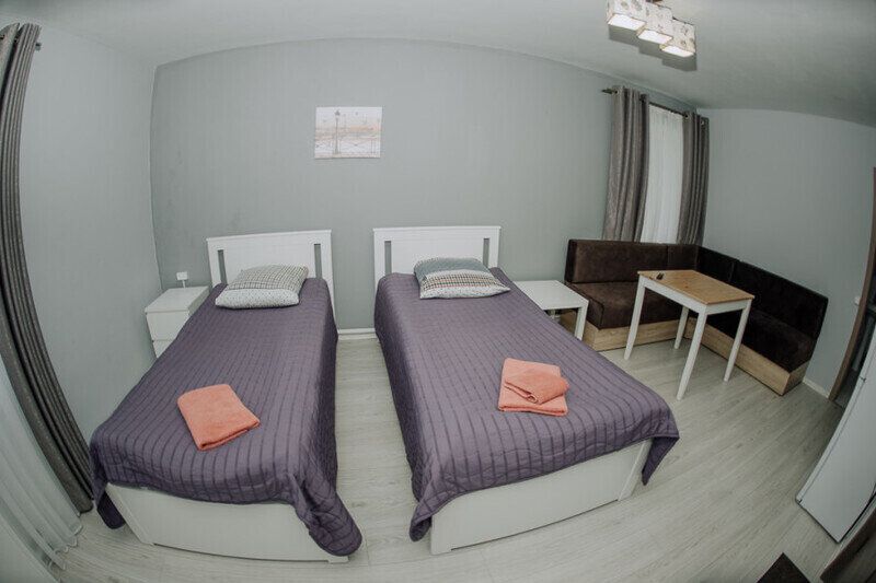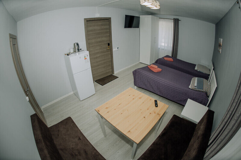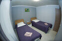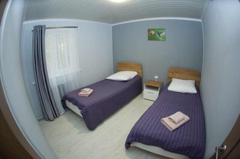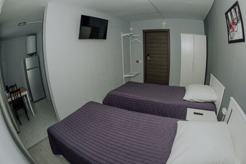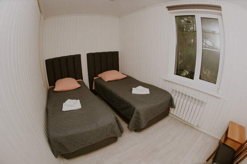 Двухместный номер: одна комната, 2 одноместные кровати. Все удобства в номере: душ, раковина, туалет. Для комфортного отдыха также имеются: телевизор, чайник, посуда, мини-холодильник.
