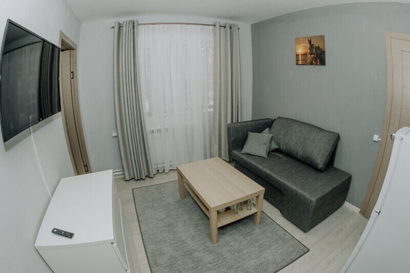 Трехместные номера с новым ремонтом. Оборудованы одной спальней с двумя односпальными кроватями и залом с диваном. В номере телевизор, чайник, посуда, холодильник.