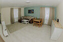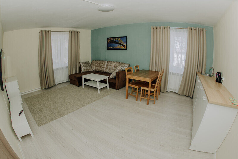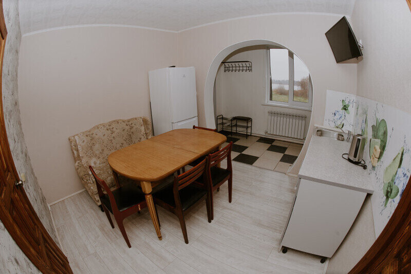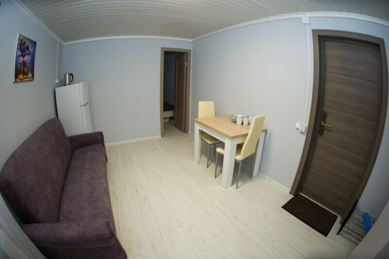 Четырехместный номер: с кухней и 2-мя комнатами. Все удобства в номере: душ, раковина, туалет. Для комфортного отдыха также имеются: телевизор, чайник, посуда, холодильник.