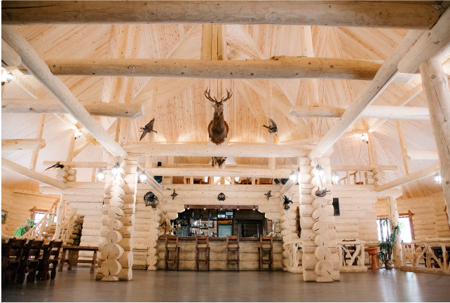 Зал состоит из основного зала с барной стойкой, второго света, гардеробной, санузла и кухни. Банкетный зал на первом этаже — это 180 посадочных мест. Два крыла второго света могут разместить еще по 20 человек.