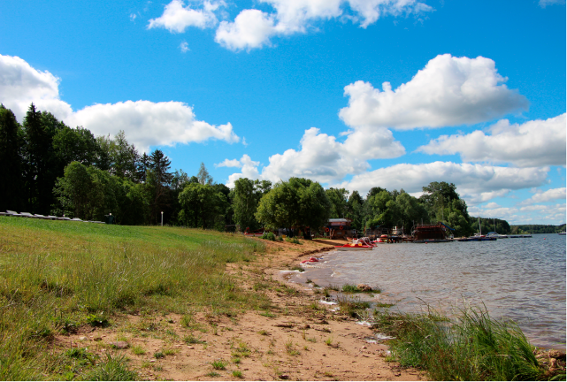 Оборудованный песчаный пляж в Красновидово для летнего отдыха с детьми.