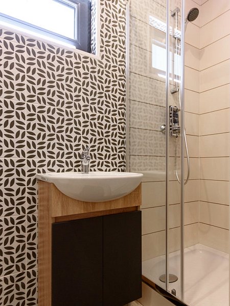 Санузел с душевой кабиной: набор полотенец, гель, мыло, шампунь.