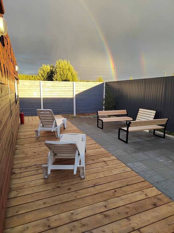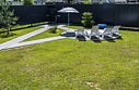 На территории дома есть все условия для полноценного отдыха: мангальная зона, просторная веранда, зеленая зона для детей и занятий йогой, а также шезлонги, которые позволяют насладиться солнечными лучами.
