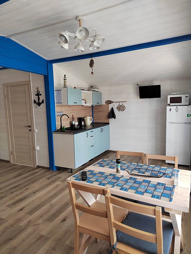 Гостевой дом построен по принципу апартаментов. В каждом номере есть кухня или кухонная зона, в которой есть все необходимое для приготовления пищи: электроплита, микроволновая печь, электрочайник, кофеварка, холодильник, полный комплект кухонной и столовой посуды и столовые приборы.