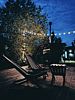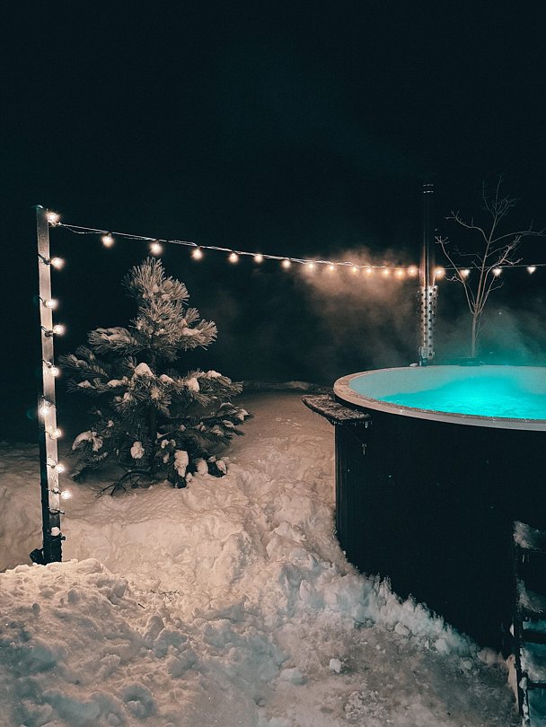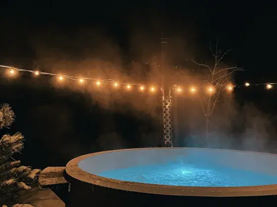 В джакузи есть гидромассаж и цветная подсветка. А вокруг — гирлянда огоньков.