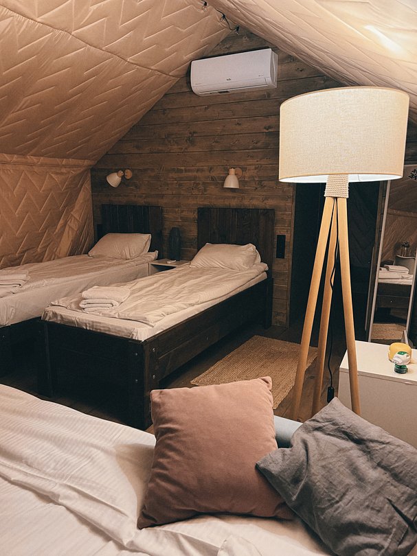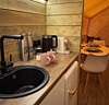 На территории есть два гостевых домика, два сафари-тента, баня с уличным джакузи и банный чан. Все это работает и зимой, и летом. В каждом домике есть кухня, оборудованная необходимой бытовой техникой и набором посуды, современный санузел с душем и туалетными принадлежностями. Домики и сафари-тенты отапливаются электрическими конвекторами, каждый оборудован кондиционером и приточной вентиляцией.