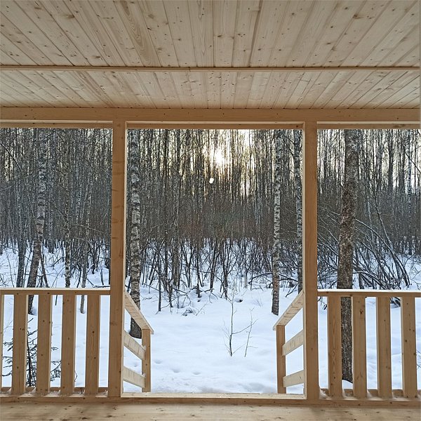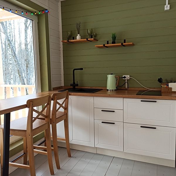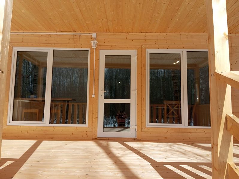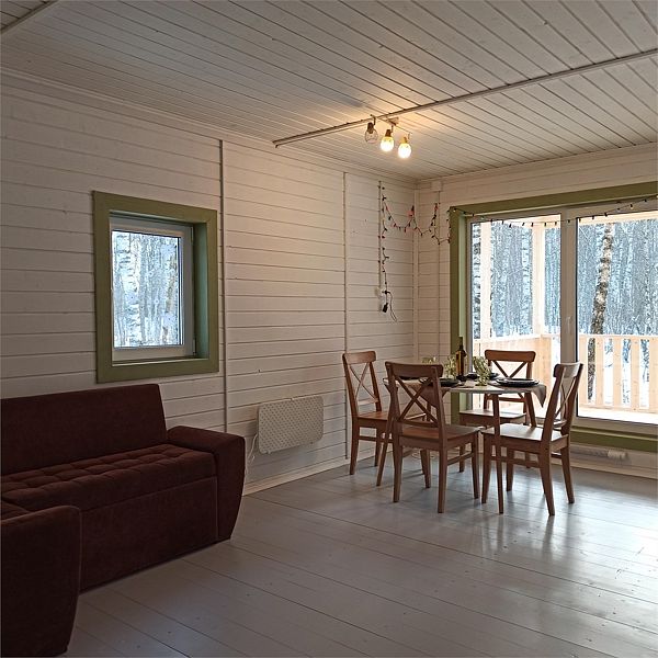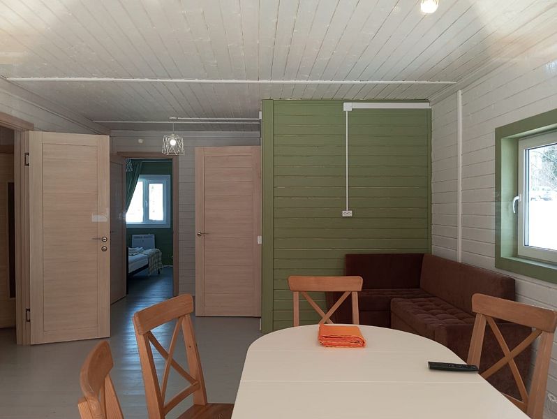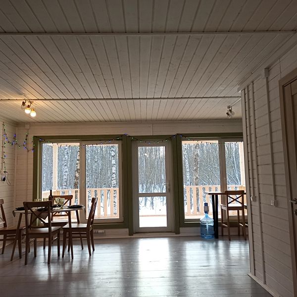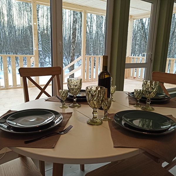 Большой дом с кухней и сауной в доме. Панорамные окна и веранда с видом на лес. В доме есть гостиная зона и 2 спальные комнаты. На кухне есть вся необходимая посуда, столовые приборы. Мангальная зона на территории.