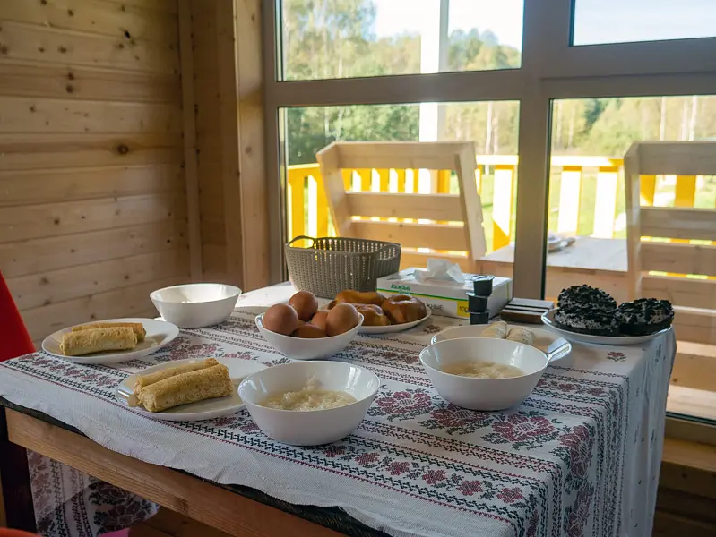 Завтрак в глэмпинге отличается особым качеством, поскольку используются преимущественно фермерские продукты с собственной мини-фермы и сыроварни. Сытный и аппетитный завтрак входит в стоимость проживания в зависимости от выбранного тарифа. Также доступен завтрак в формате «шведского стола» за дополнительную плату 600 ₽, который подается с 9:00–11:00.