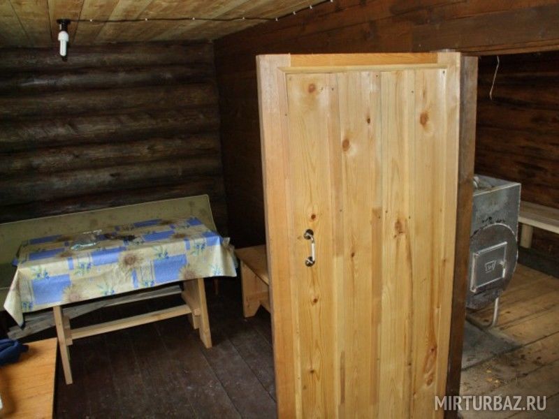 В бане: комната отдыха на 4-6 человек, стол, стулья и лавки, тазы и ведра. Освещение в бани осуществляется с помощью солнечных батарей.