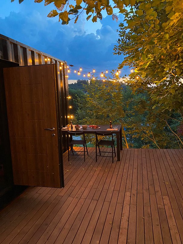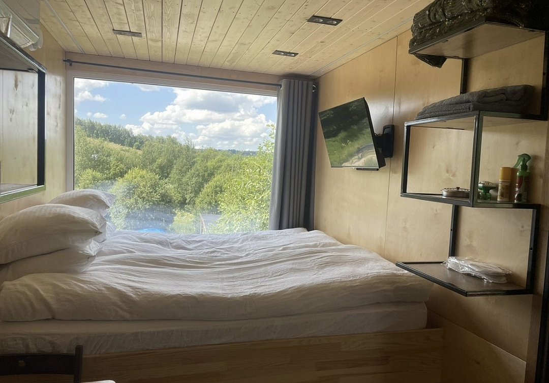 В доме установлена просторная кровать размером 200×180 см с белоснежным постельным бельём из 100% хлопка. Имеется дополнительное выдвижное спальное место размером 160×80 см. На всей территории доступен Wi-Fi. Также предусмотрены кондиционер и система принудительной вентиляции.
