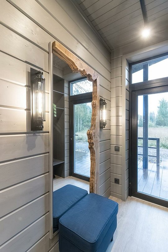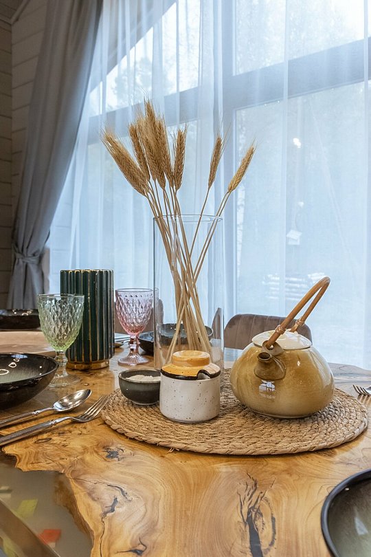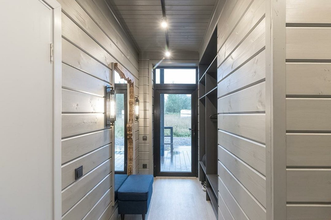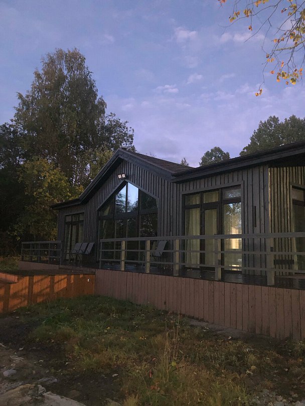 В одноэтажном доме установлена система «умный дом». Имеется камин, три спальни с ортопедическими матрасами, меланжевым постельным бельем, пуховыми одеялами и подушками. В ванной комнате — полотенца и фен.