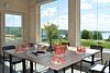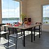 Кастрюли, сковороды, посуда, столовые приборы — всё как дома. Здесь же стоят столы перед панорамными окнами.