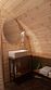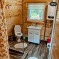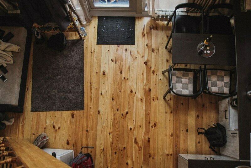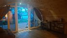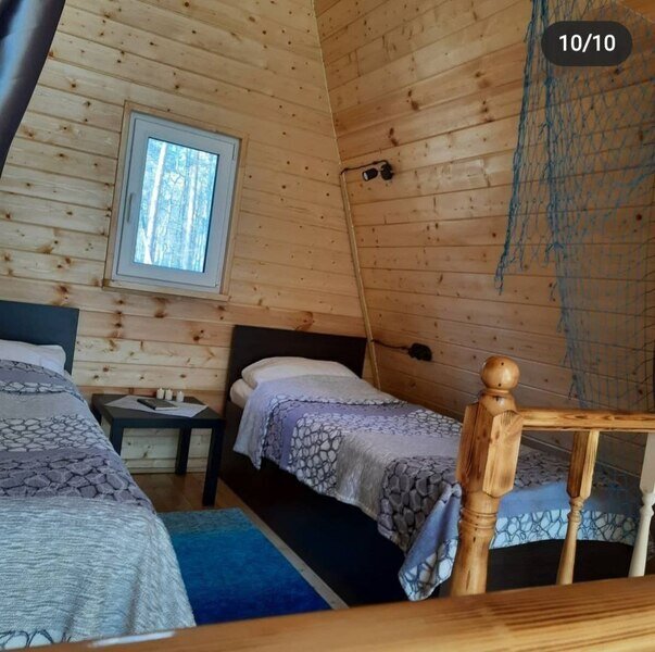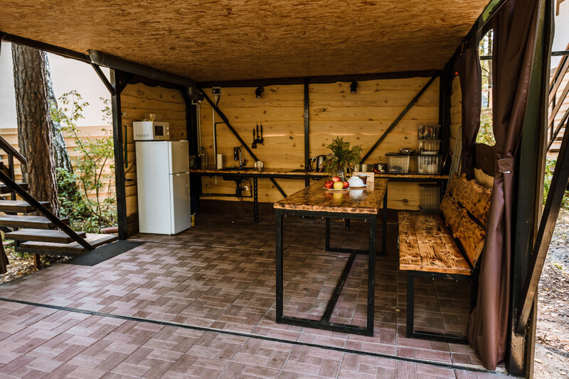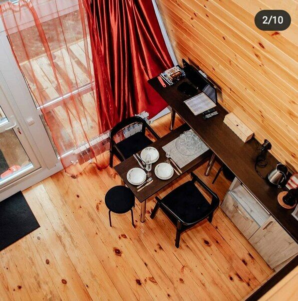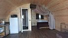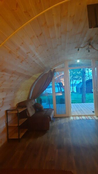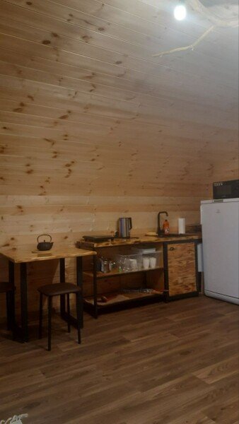 Домик рассчитан на два основных места и два дополнительных. Внутри комната, в которой объединена зона для приготовления пищи, зона отдыха (гостиная) и спальное место.
