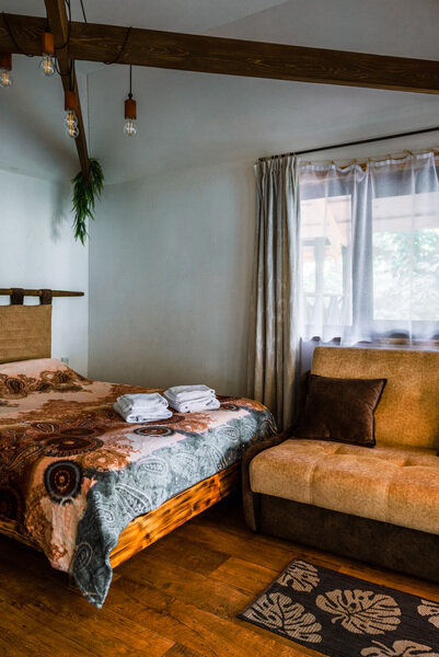 Для отдыха предлагается раскладной диван со спальным местом 130х180 (доп.место), а также двухспальная кровать 140×200. Постельное белье по количеству человек: комплект постельного белья (простынь, наволочки, пододеяльник), плед на кровати. Одеяла, подушки, для большего комфорта есть перинка на матрасе.