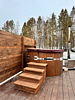Горячий банный чан под открытым небом. Парение в банном чане на улице комфортно и приятно в любую погоду. В чане горячая вода с добавками (по желанию), внутри удобные сиденья, снаружи — лестница для удобства погружения и выхода из чана.