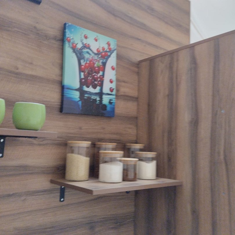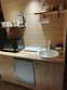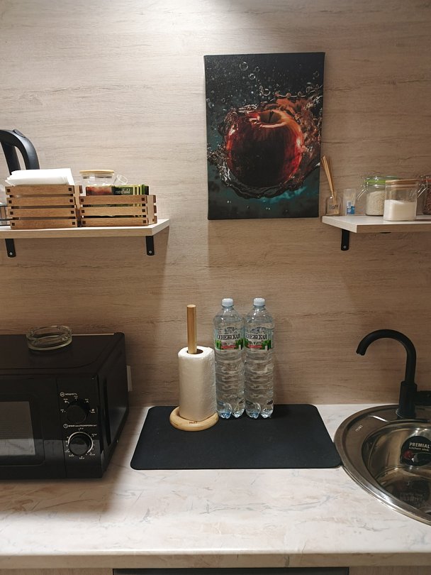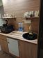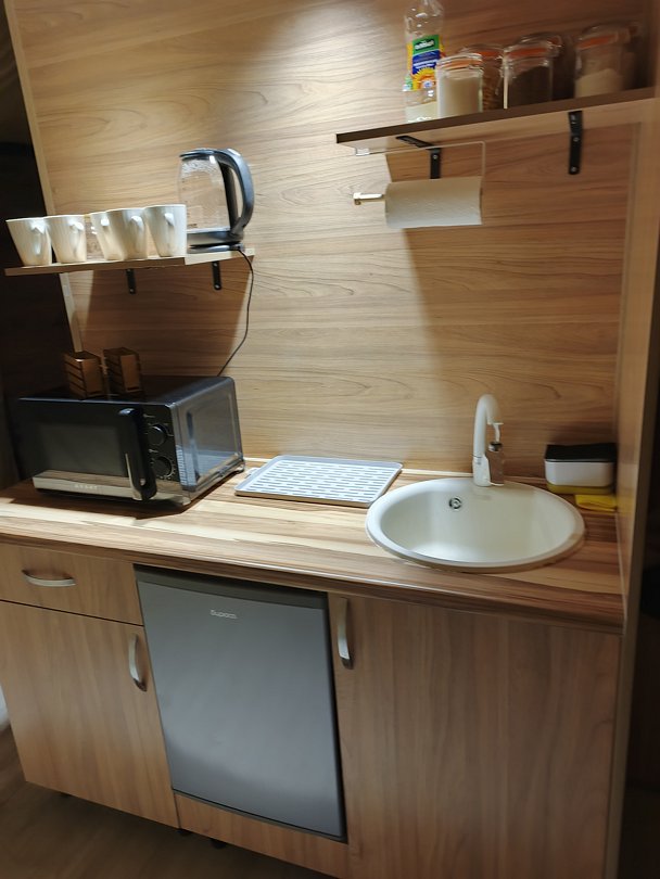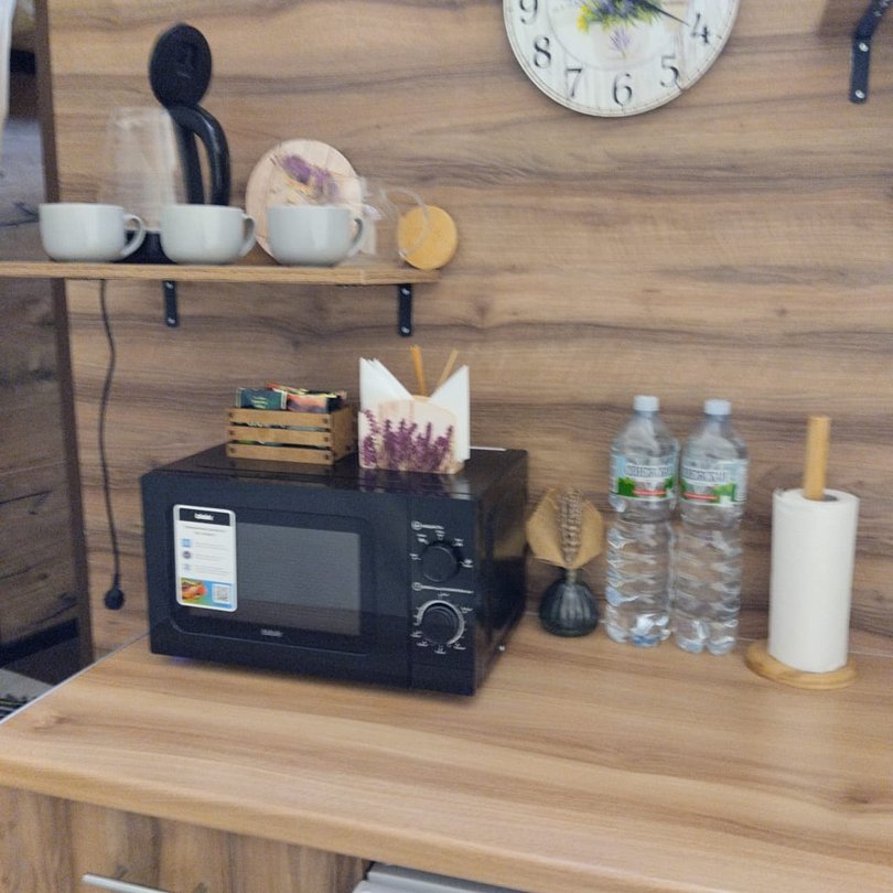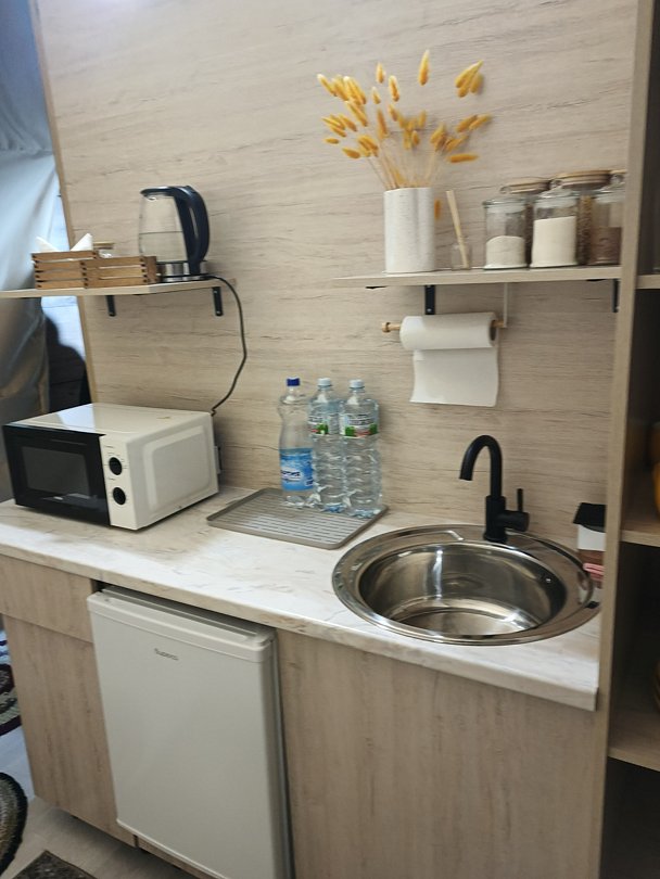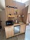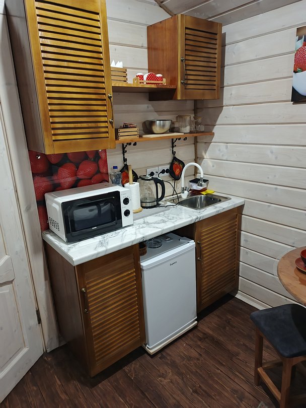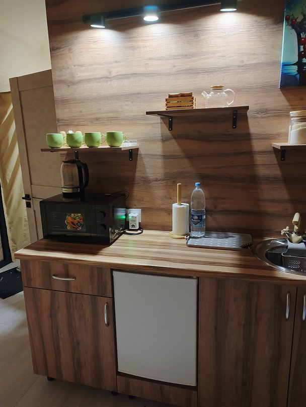 Мини -кухня: микроволновая печь, небольшой холодильник, электрическая варочная панель, чайник, новая стильная посуда.