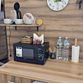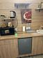 Мини-кухня :небольшой холодильник, микроволновая печь, электрическая варочная панель, чайник, стильная посуда.