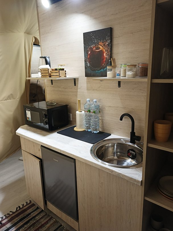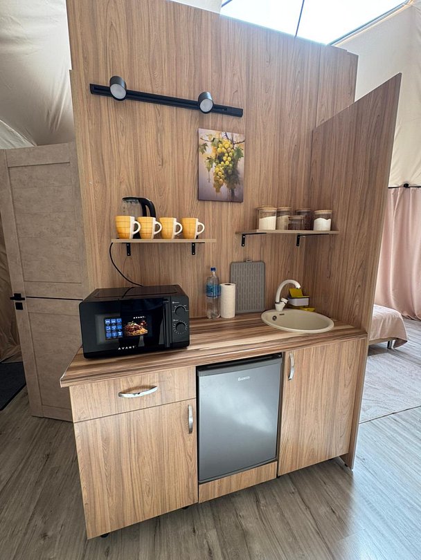 К услугам гостей — мангальная зона, чайный домик и личная горячая купель возле каждого глэмпа. На территории разбит фруктовый сад с яблонями, вишнями, сливами, абрикосами, смородиной и малиной. В сезон сбора урожая гости смогут полакомиться свежими и экологически чистыми фруктами и ягодами.