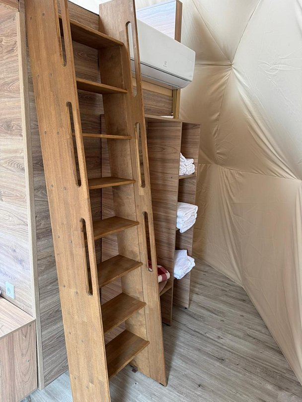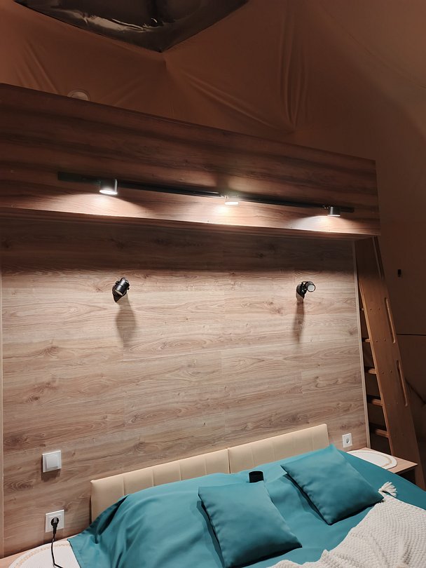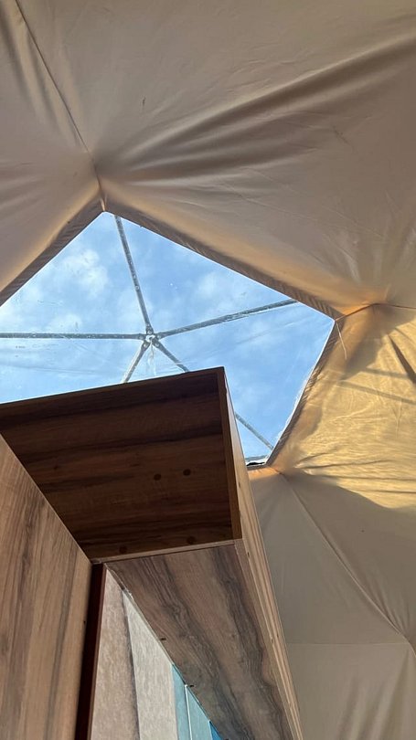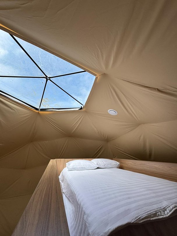 В куполе есть всё для комфортного отдыха: сверху — кровать с видом на звездное небо, внизу двухместная кровать, мини-кухня, обеденный стол со стульями, ванная комната.
