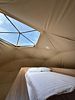 В куполе есть всё для комфортного отдыха. Внизу двухместная кровать, обеденный стол со стульями, мини- кухня, ванная, сверху два спальных места.
