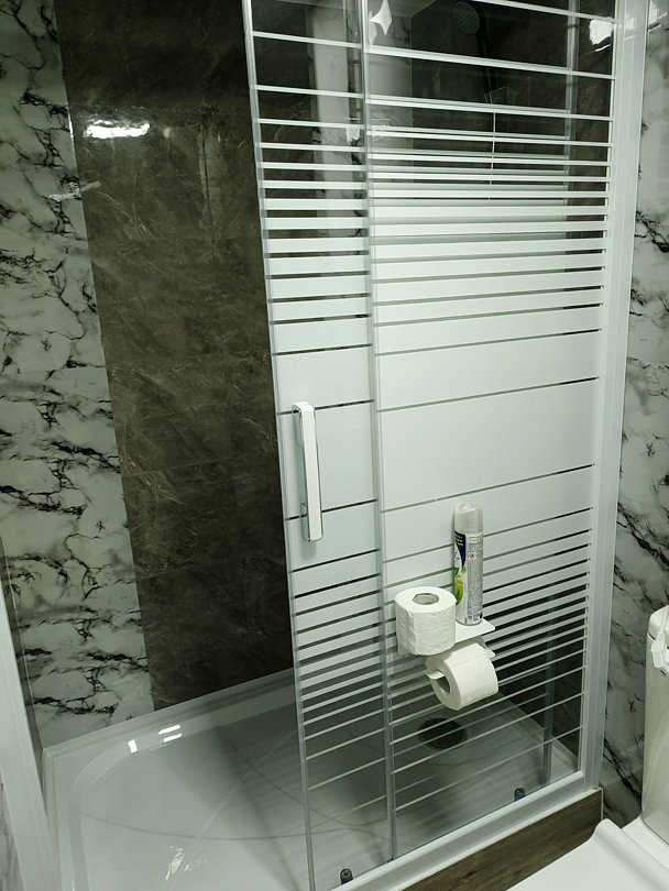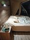 Внизу двухместная кровать, мини-кухня, обеденный стол со стульями, ванная комната. Сверху два спальных места.