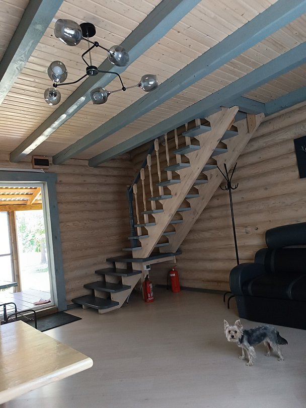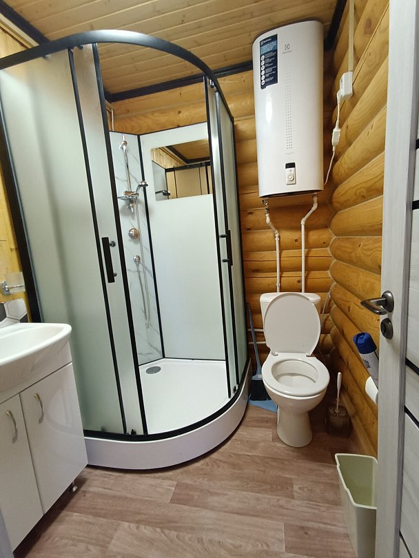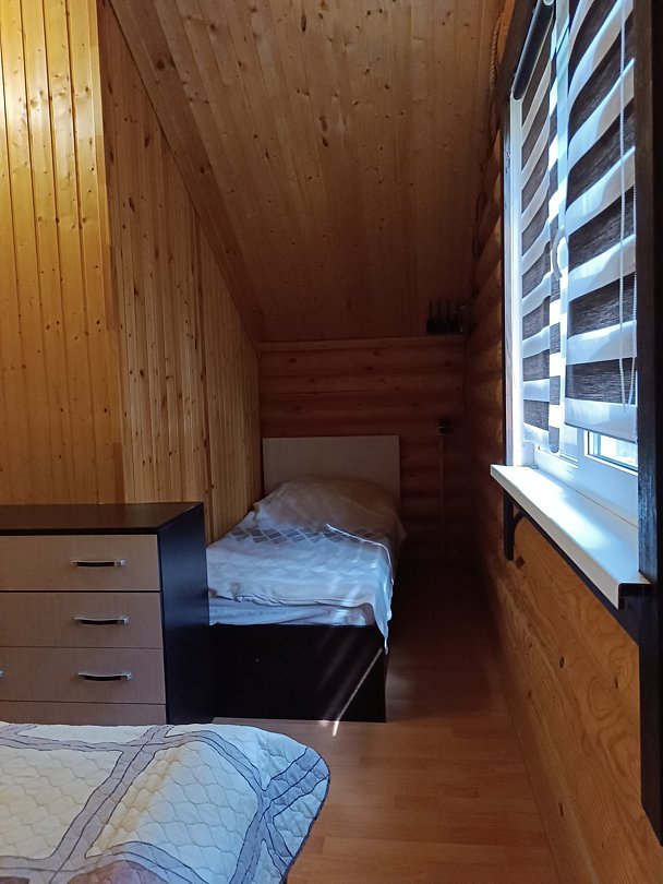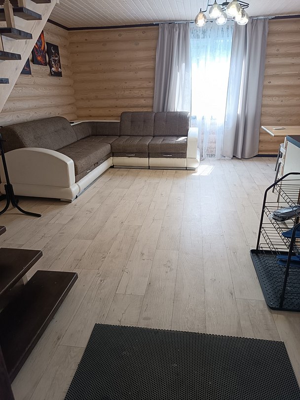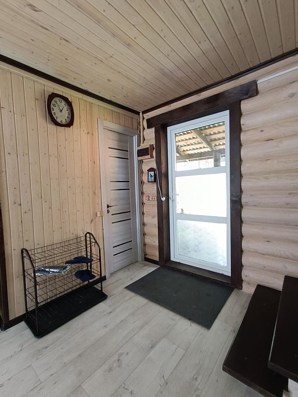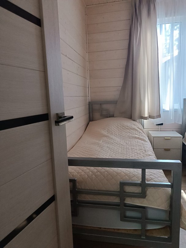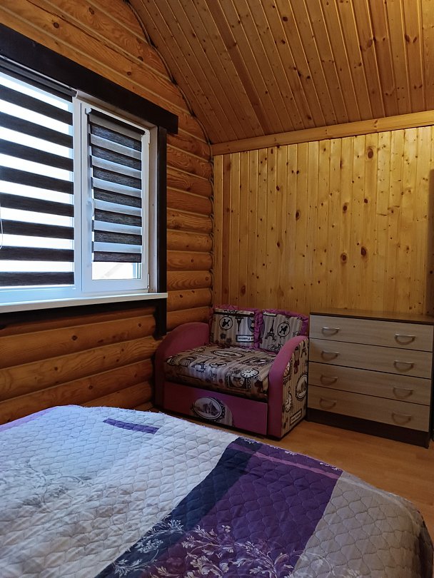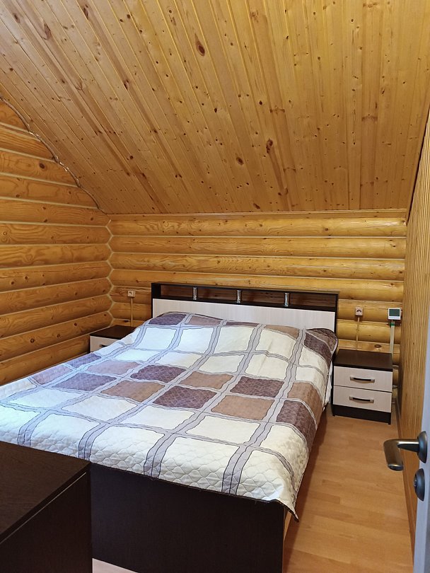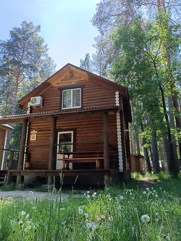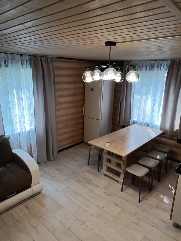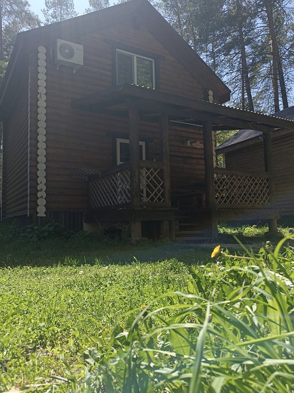Срубовый двухэтажный дом. Предназначен для круглогодичного отдыха. Отапливатся теплыми полами. Дом рассчитан на 7 взрослых и 1 ребенка. Рядом с домом стоит детский спортивный комплекс и две качели.