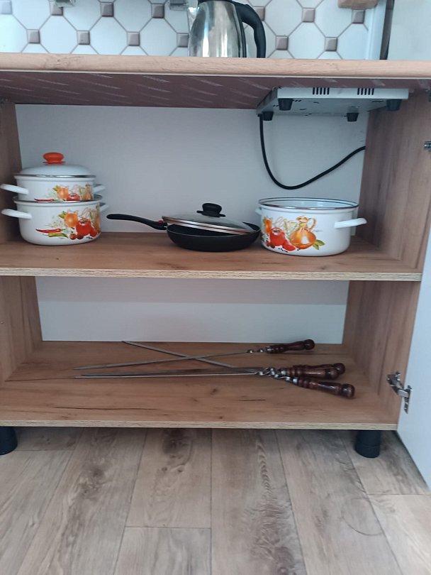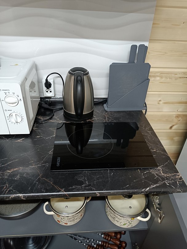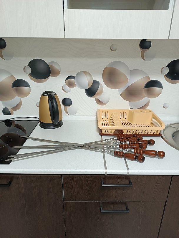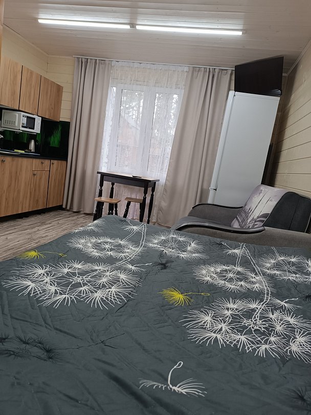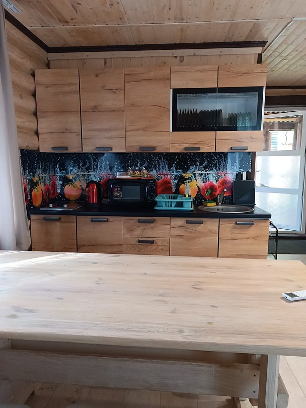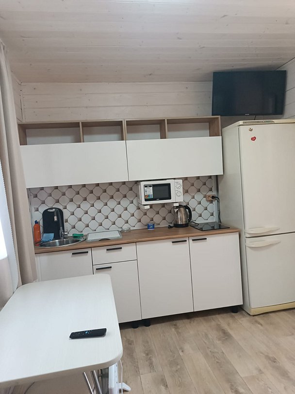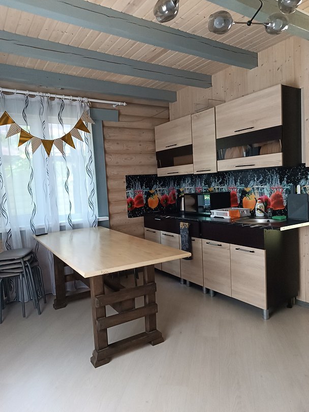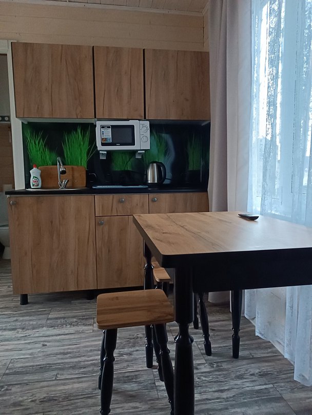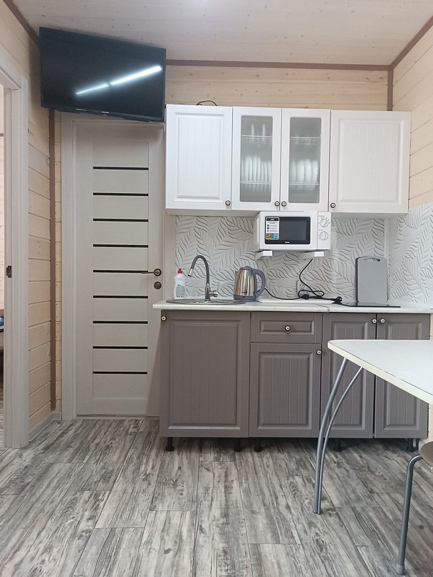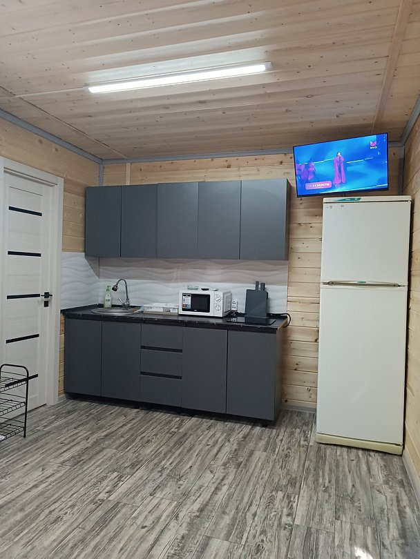 Кухня-гостиная: большой угловой диван, телевизор, wi-fi, холодильник, кухонный гарнитур, большой обеденный стол + табуретки, встроенная двухкомфорочная варочная поверхность, микроволновая печь, электрический чайник, вся кухонная утварь (от штопора до кастрюли), шампура.