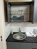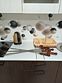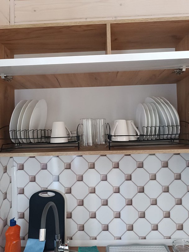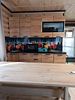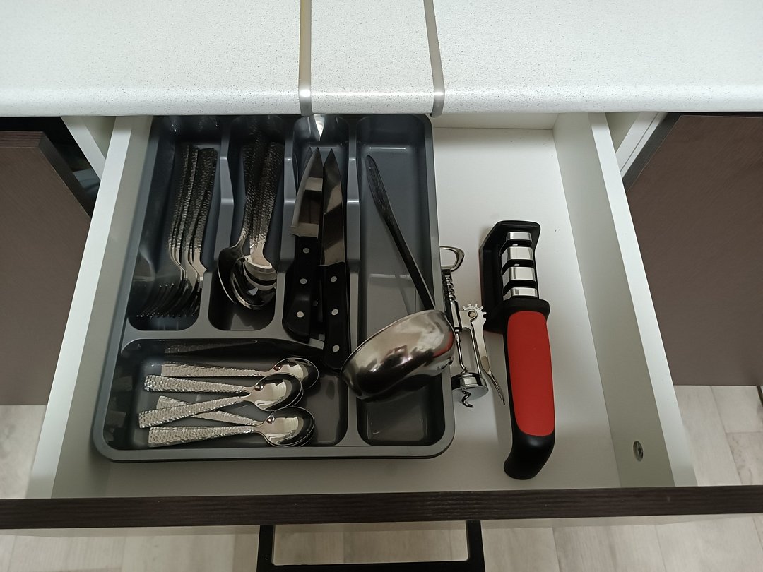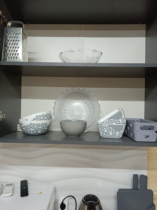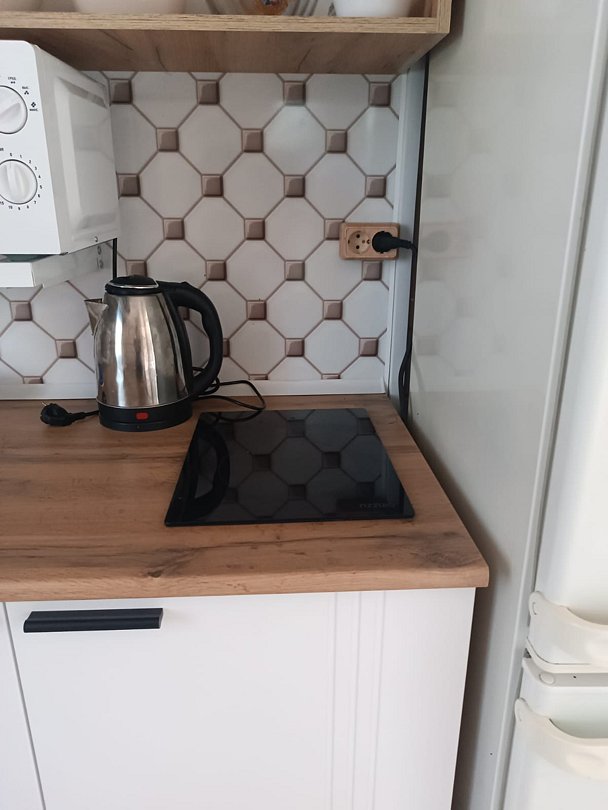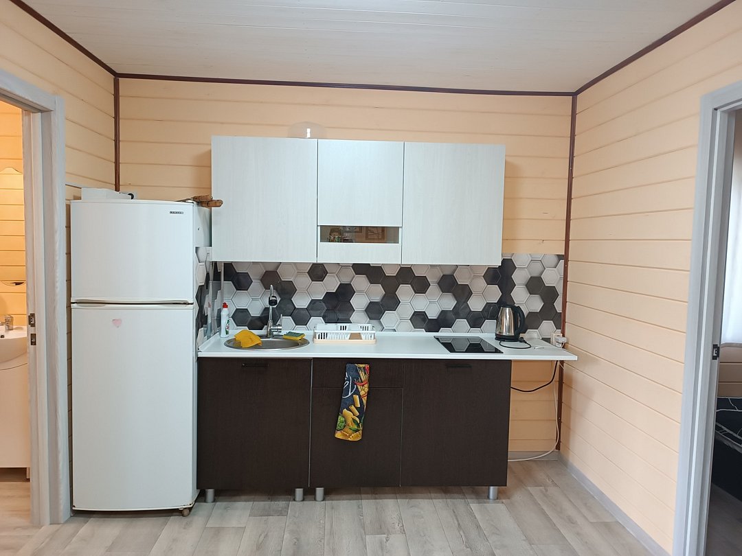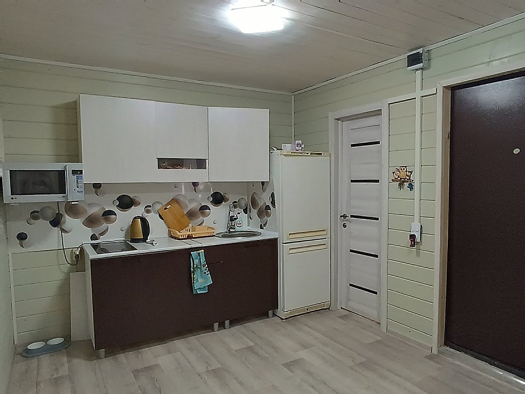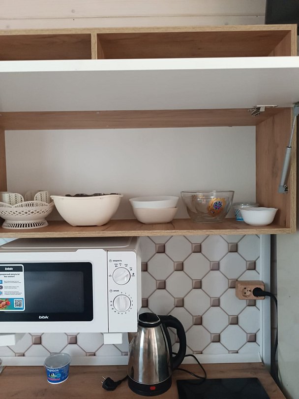 Кухня-гостиная: большой угловой диван, телевизор, wi-fi, холодильник, кухонный гарнитур, большой обеденный стол + табуретки, встроенная двухкомфорочная варочная поверхность, микроволновая печь, электрический чайник, вся кухонная утварь (от штопора до кастрюли), шампура.