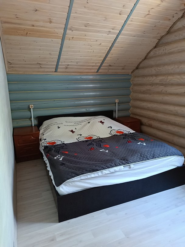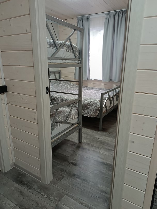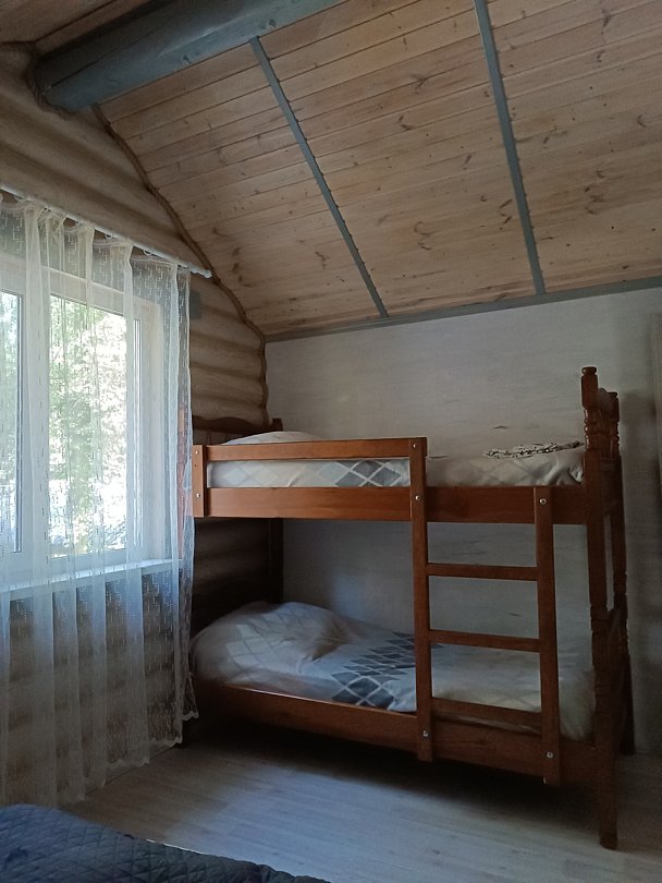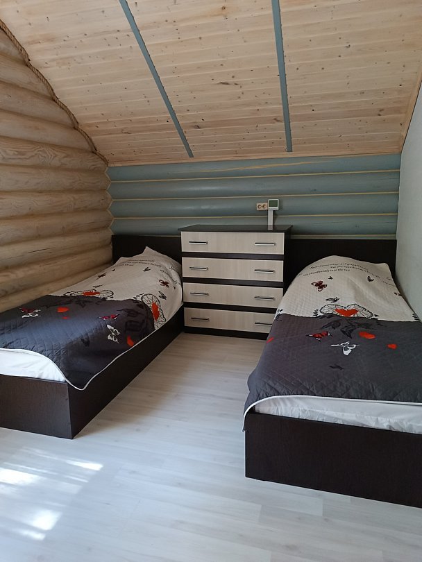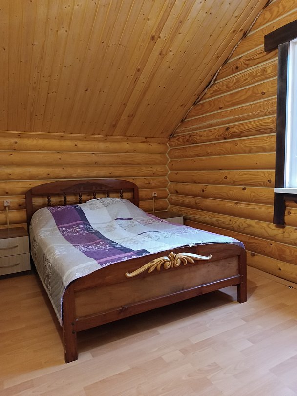 Срубовый двухэтажный дом. Предназначен для круглогодичного отдыха. Дом рассчитан на 7 взрослых и 1 ребенка. Дом предназначен для круглогодичного отдыха, отапливается теплыми полами. Рядом с домом стоит детский спортивный комплекс и две качели.