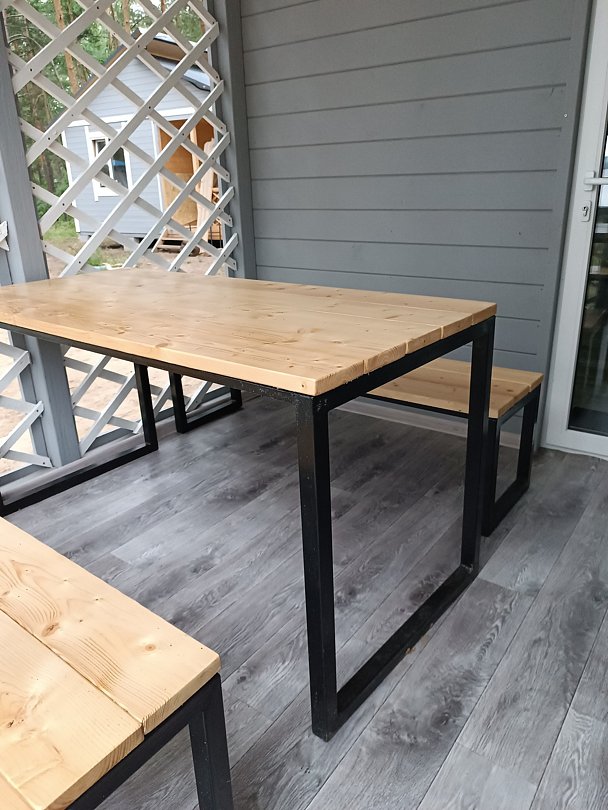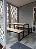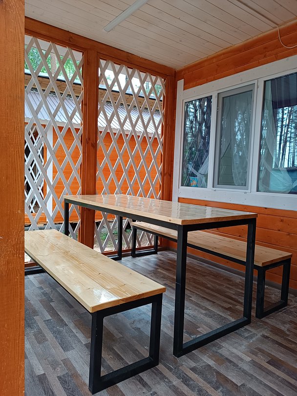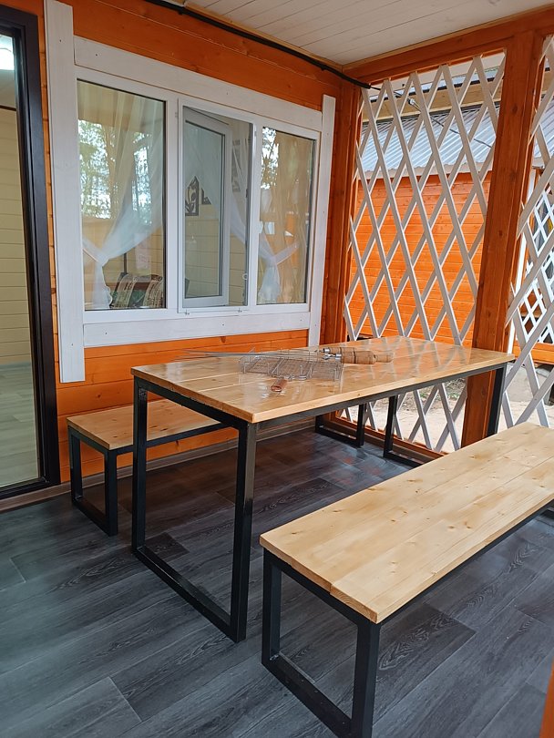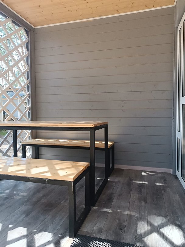 На веранде есть стол и две лавки, выполненные в стиле лофт.