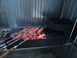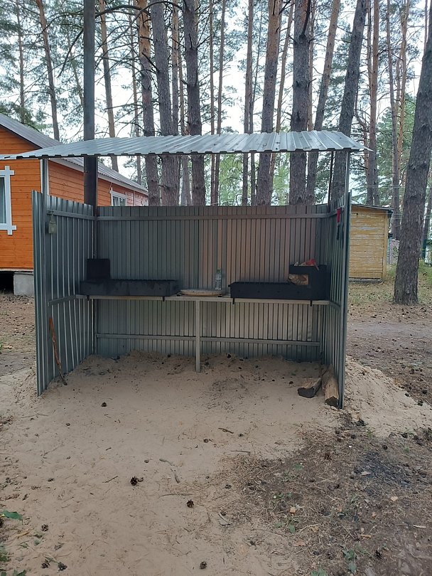 К дому пристроена веранда, в которой стоит большой стол и две лавки. Есть мангальная зона с двумя мангалами и напольной печкой для казана.