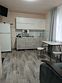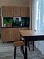 Кухня-гостиная: диван, обеденный стол, кухонный гарнитур, микроволновая печь, чайник, встроенная варочная поверхность, кухонный инвентарь от штопора до кастрюли.