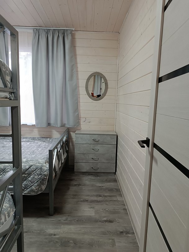 - спальня комната №1: двуспальная кровать, прикроватная тумбочка с каждой стороны, детская двухъярусная кровать;