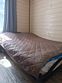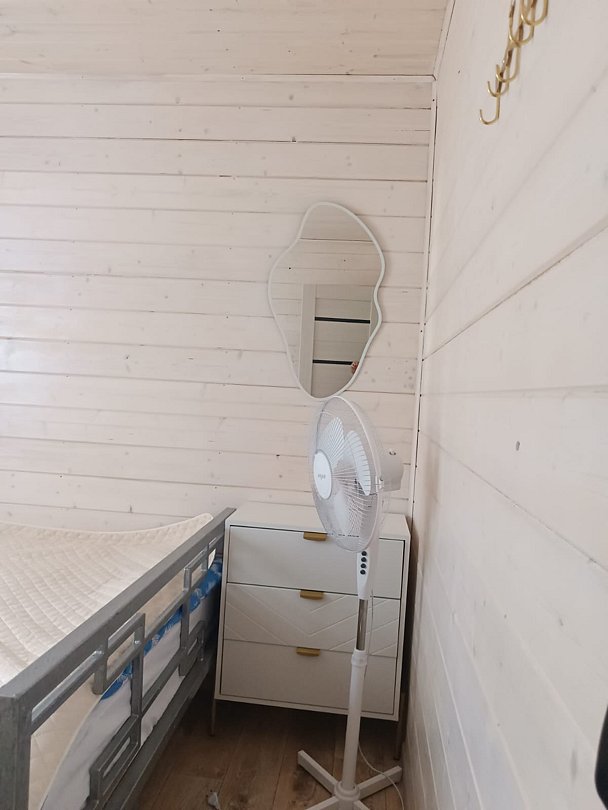 В спальне стоит двуспальная и односпальная кровати, тумбочка, комод, зеркало.