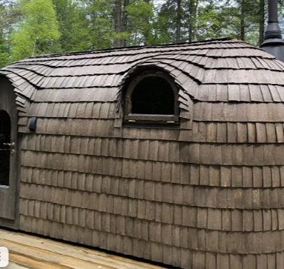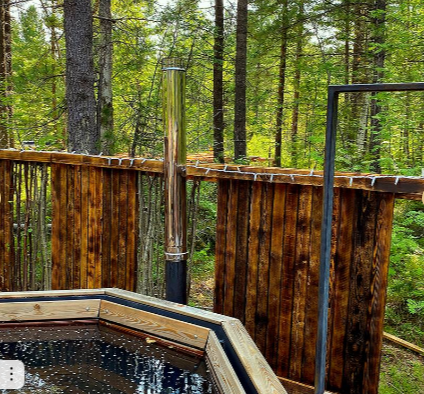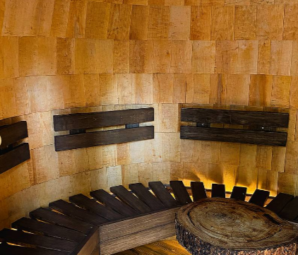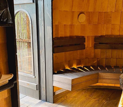 В самом сердце парк-отеля, утопающего в пышном лесу, расположена сказочная парилка из дранки, источающая тепло и благоухание. Стены парилки искусно сплетены из тонких деревянных щепок, создавая узор, напоминающий кружево. Рядом с парной стоит большой чан с теплой водой, приглашая гостей погрузиться в блаженство.