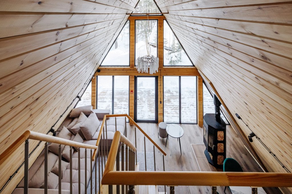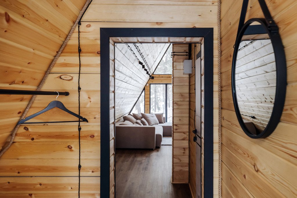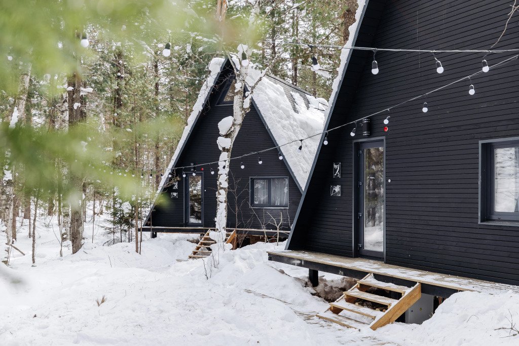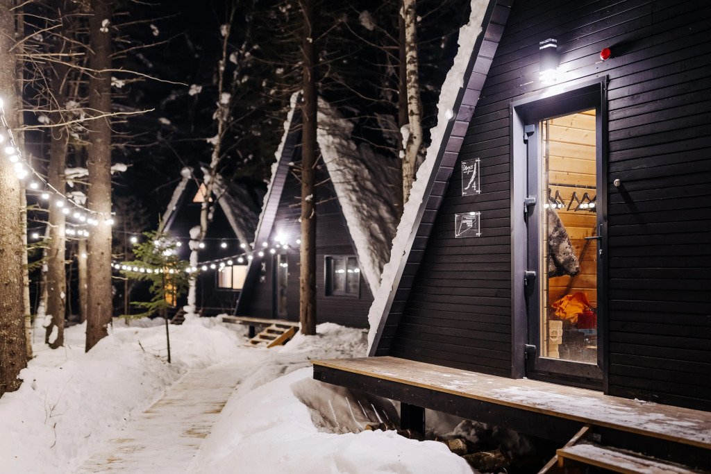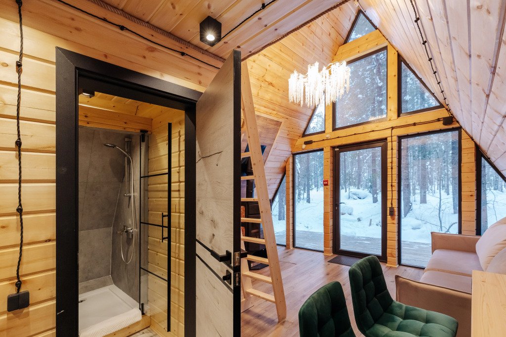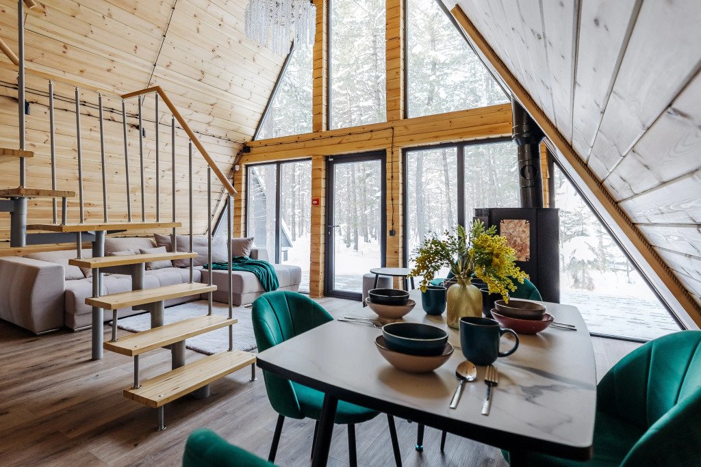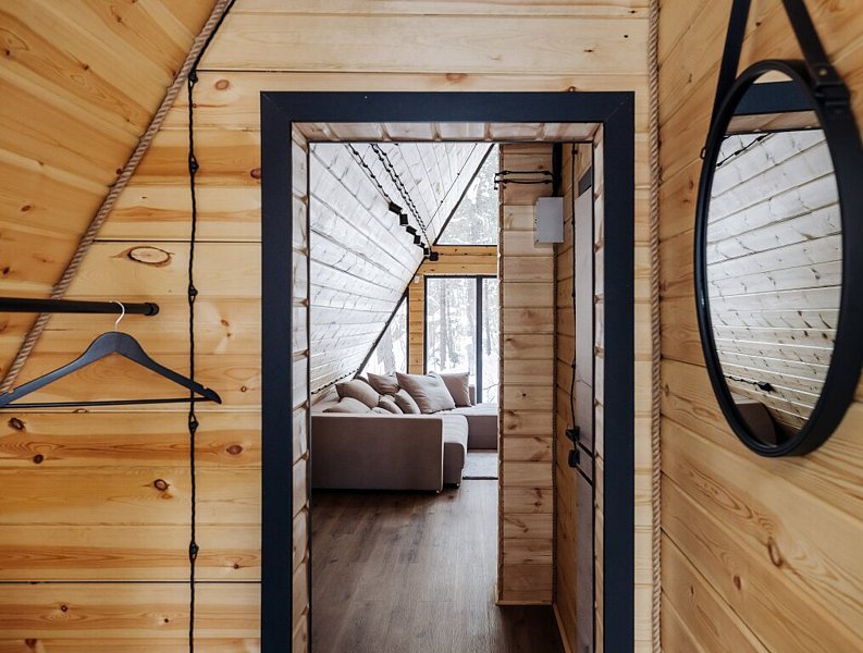 На территории расположены дома в стиле а-фрейм, в которых гости найдут спальни, гостиные, оборудованные кухни, собственные камины и панорамные окна с видом на тайгу, а также террасу.