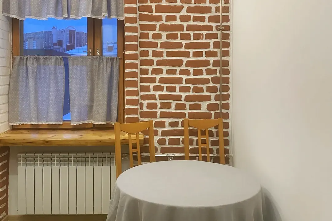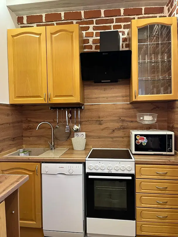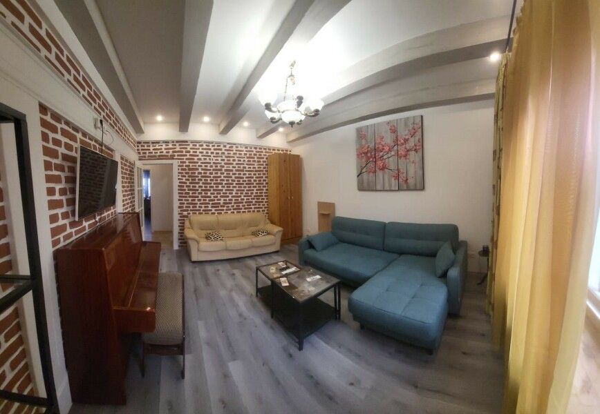 Просторная светлая гостиная сочетает комфорт и функциональность. Кухня полностью укомплектована всем необходимым, что делает процесс приготовления пищи приятным и простым. Высокие потолки и открытые фактуры стен придают интерьеру особый шарм.