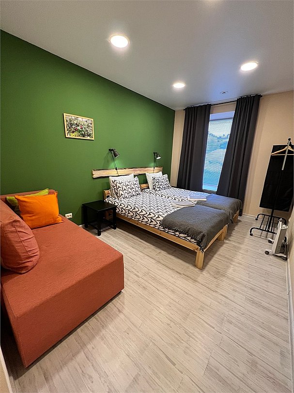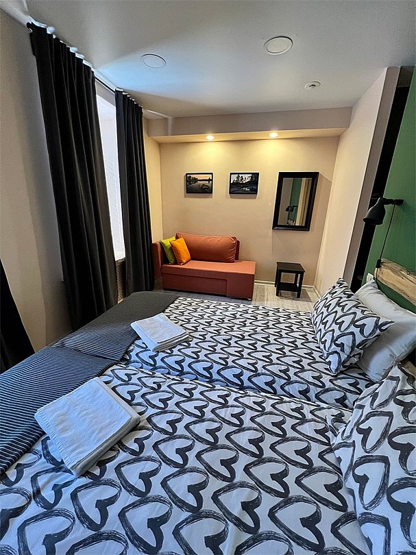 Wi-Fi, кондиционер, светильник, настольные лампы, фен, утюг, обогреватель, ванная комната, душевая кабина, санузел, водонагреватель, теплый пол, банные полотенца, тапочки, гигиенические средства, две односпальные кровати, диван, вешалки, багажная тумба, зеркало, обслуживание номеров, унитаз, раковина, мягкая мебель, отопление, отдельный вход в номер, вид на город, вид во двор, ламинат, туалетные средства, раскладной диван, теплые полы, номер для некурящих, гигиенический душ, угловой диван-кроватьВ гостиничном номере