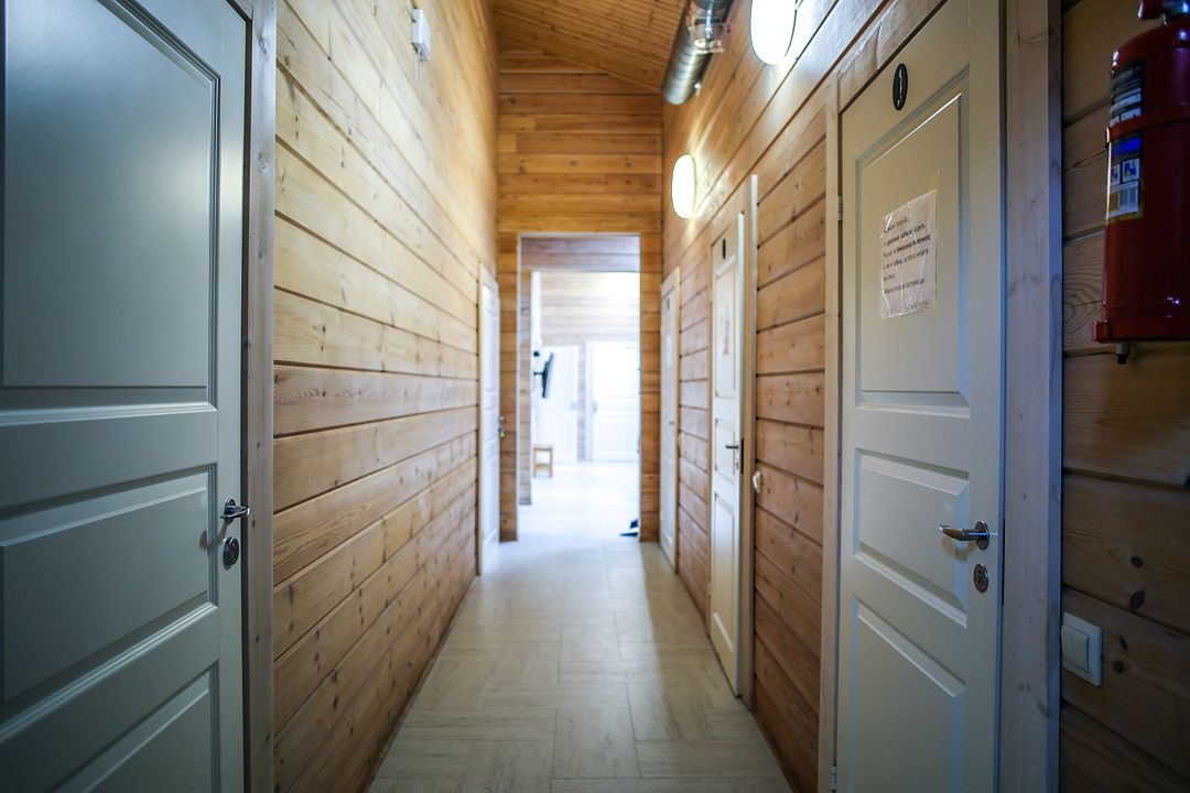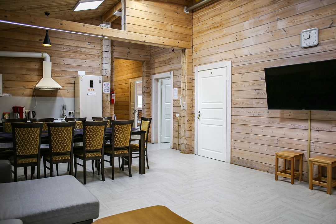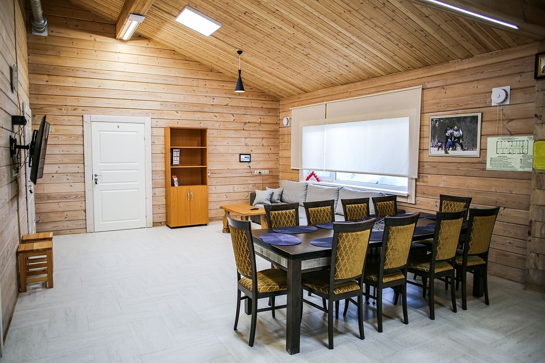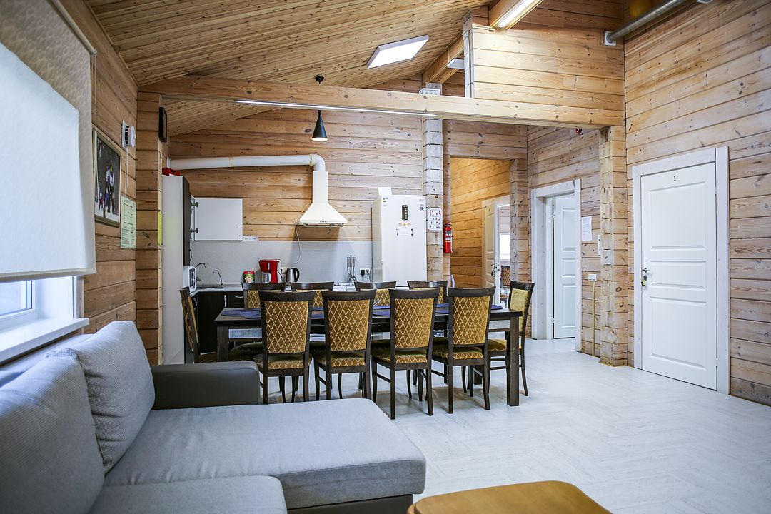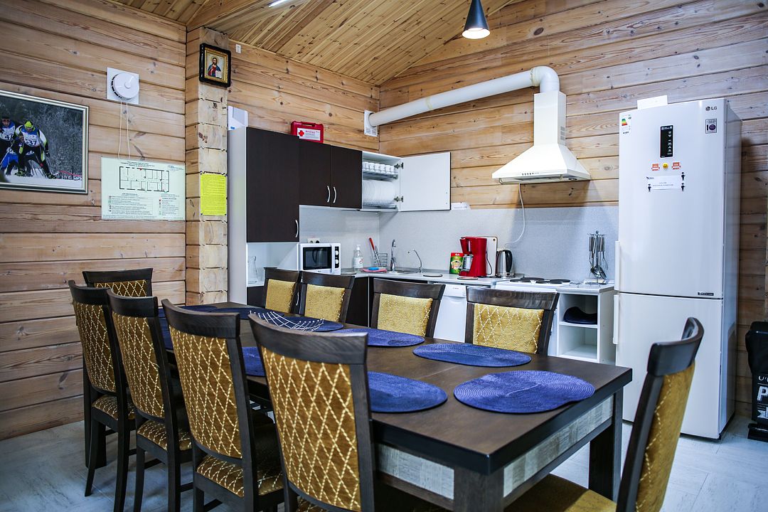 Дом оснащен уютной гостиной комнатой с диваном, большим обеденным столом, телевизором, кухонным уголком, оборудованным бытовой техникой (плитой, холодильником, посудомоечной машиной, микроволновой печью, чайником, кофеваркой, кухонными принадлежности, посудой), тремя совмещенными с душевой комнатой санузлами, стиральной машиной, теплыми полами, сервисной комнатой для хранения и подготовки спортивного инвентаря, доступом в интернет (Wi-Fi бесплатно).